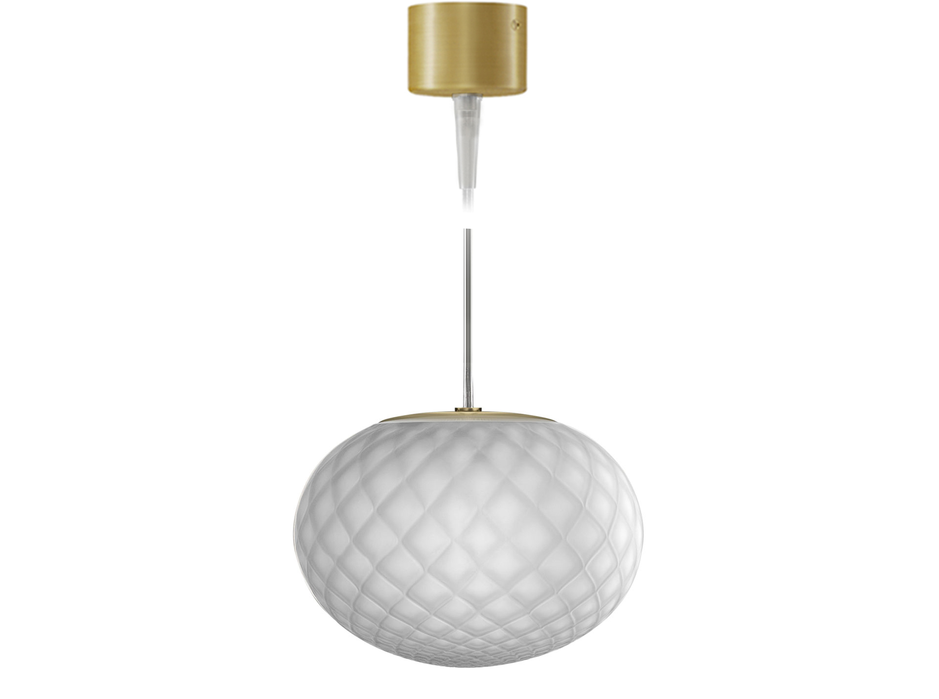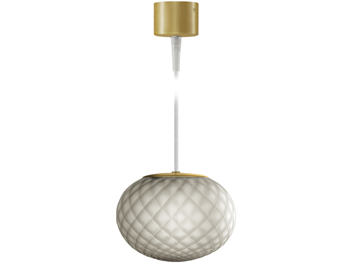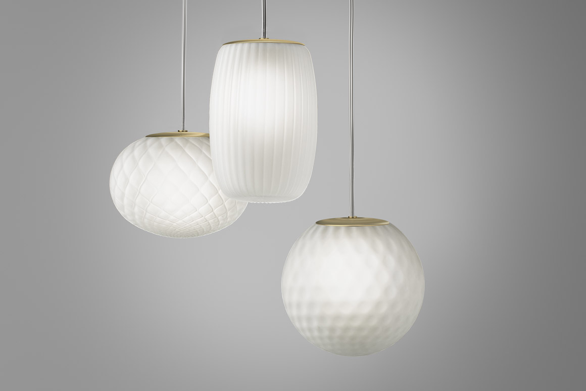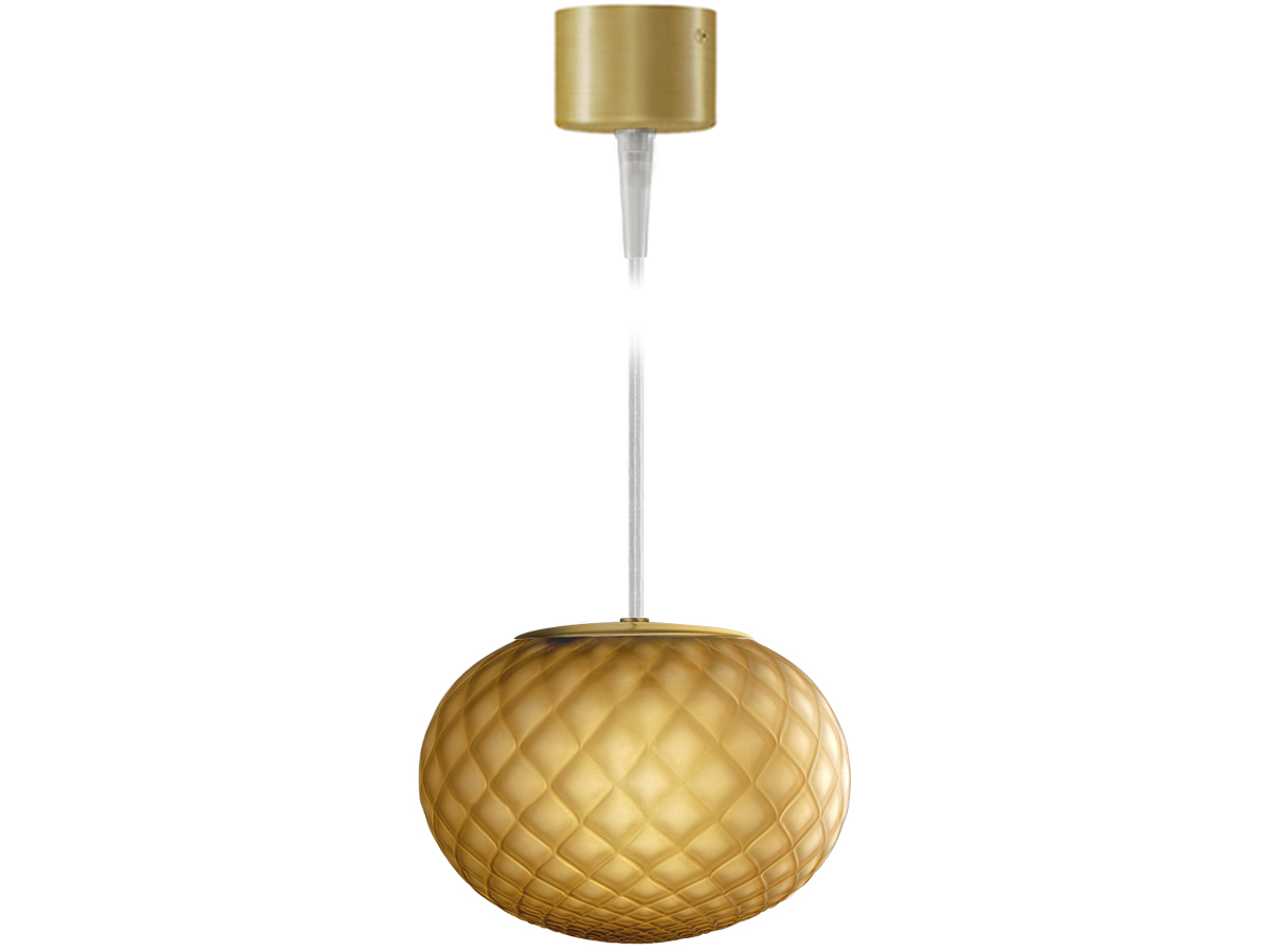 Lampade a sospensione in vetro soffiato satinato, caratterizzate dal trattamento del vetro secondo le tecniche rigadin, balloton, e ballotondo che conferiscono rispettivamente ad Ely una finitura rigata, ad Emy una trama romboidale e ad Evy un pattern sferico. Rosone in metallo rifinito con vernice poliacrilica in ottone satinato. Emissione di luce diffusa con attacco G9 per lampada LED retrofit disponibile a catalogo da ordinare separatamente. Cristallo, acciaio, ambra, bronzo, tabacco e verde le colorazioni vetro disponibili. Cavo elettrico trasparente. Disponibile rosone a scomparsa e rosoni per sospensioni multiple.