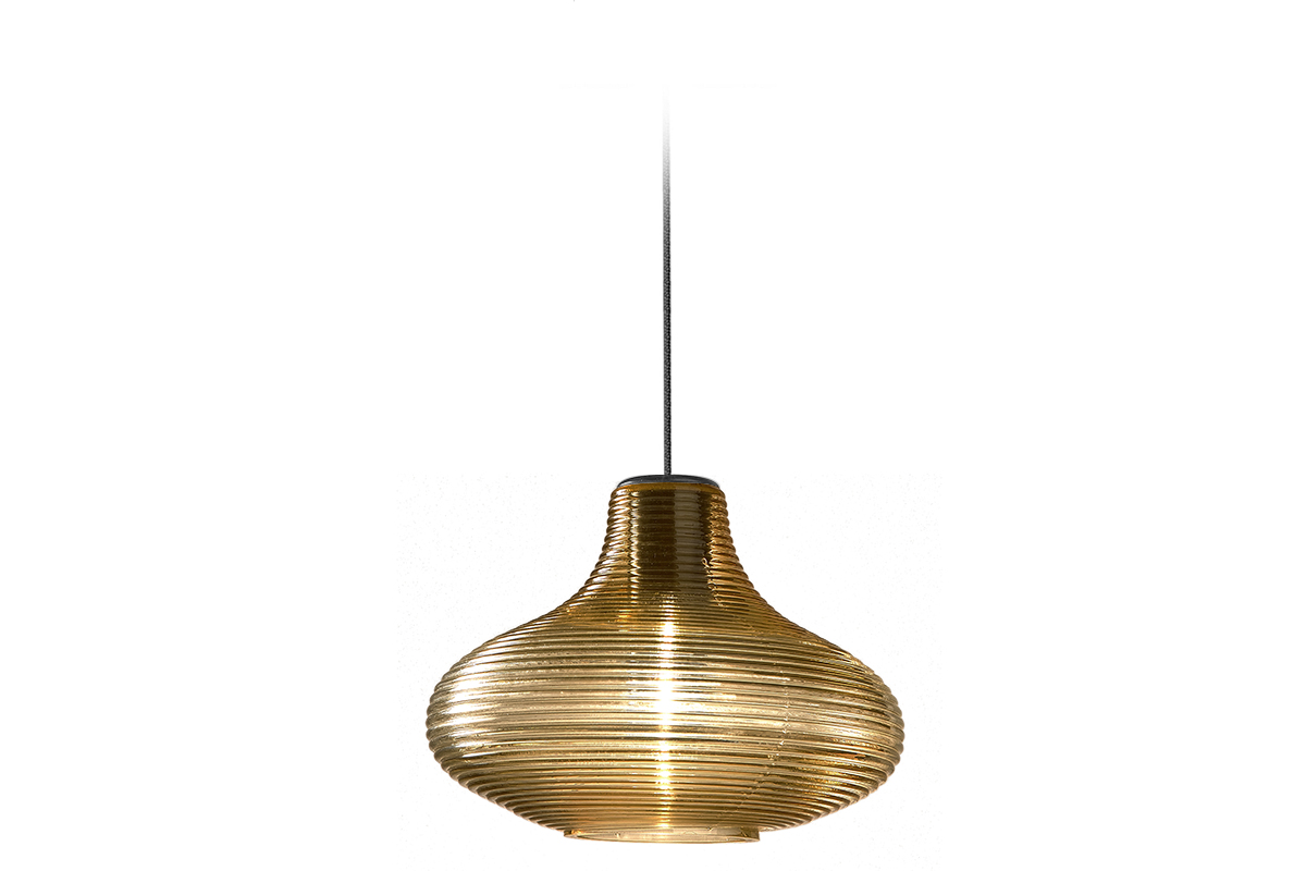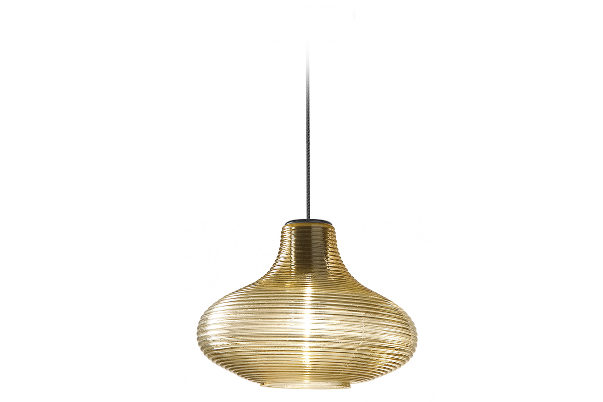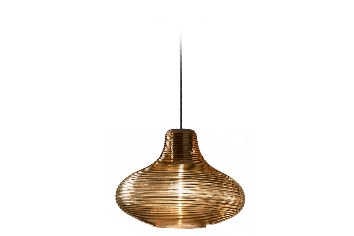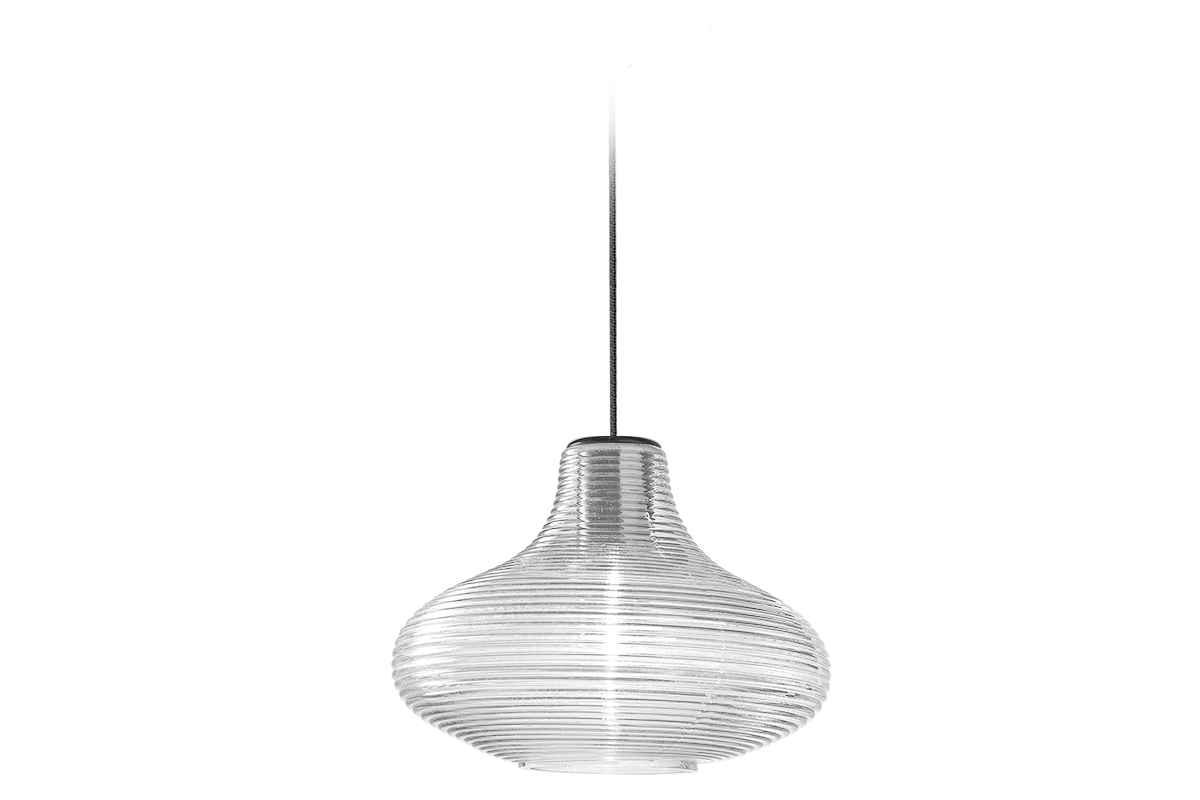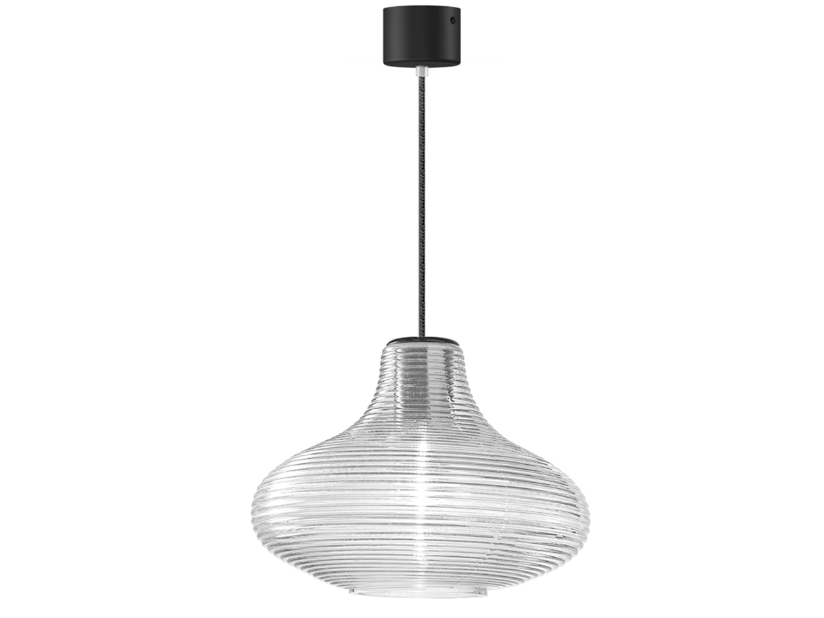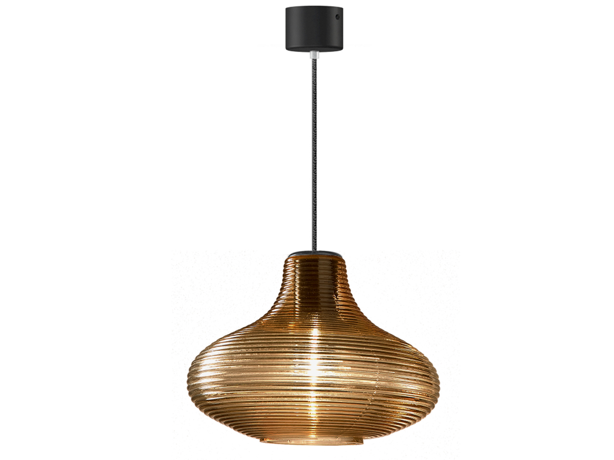 Lampada a sospensione in vetro soffiato con particolare finitura a coste dal gusto retrò. Rosone in metallo rifinito con vernice poliacrilica in color nero o nella nuova versione ottone satinato. Emissione di luce diffusa con attacco E27 e lampadina LED con filamenti a vista inclusa. Vetro soffiato disponibile in 7 colorazioni: cristallo, acciaio, ambra, bronzo, tabacco, verde e bianco lucido. Cavi elettrici in tessuto nero con possibilità di personalizzarne la lunghezza. Rosone a 8 uscite (+1 centrale). Ideale per strutture hospitality o zone living residenziali.