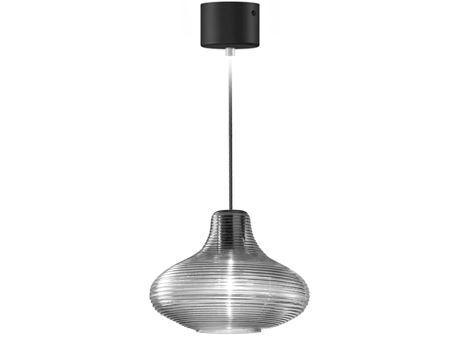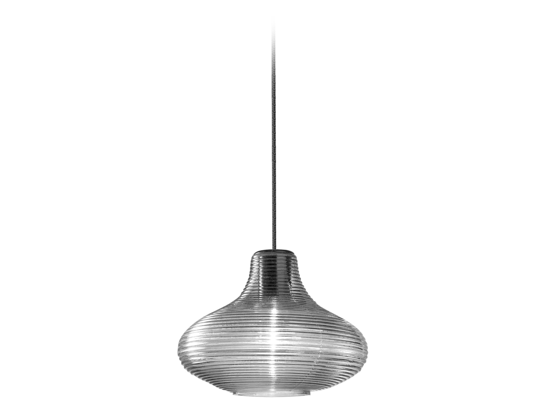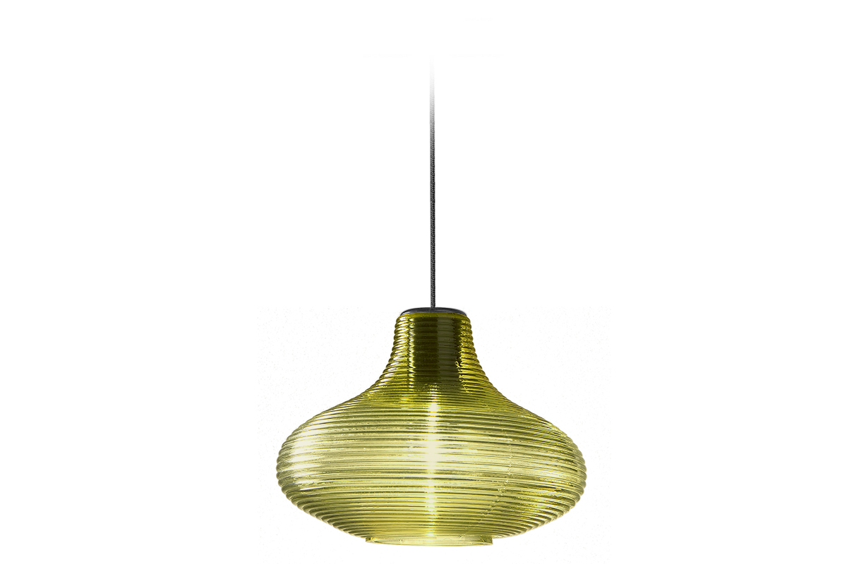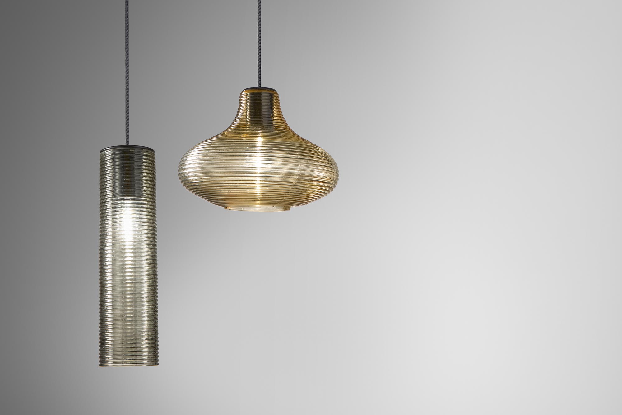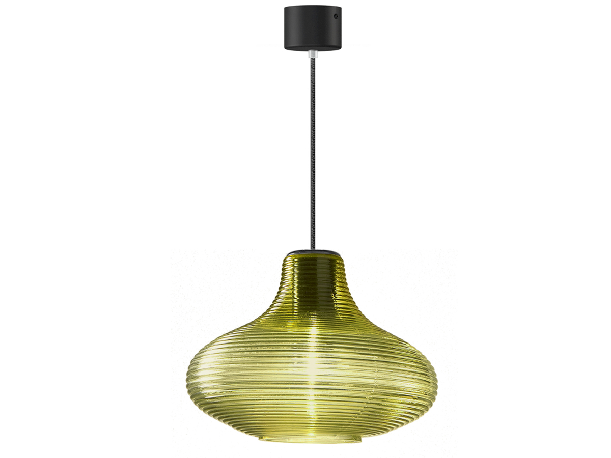 Lampada a sospensione in vetro soffiato con particolare finitura a coste dal gusto retrò. Rosone in metallo rifinito con vernice poliacrilica in color nero o nella nuova versione ottone satinato. Emissione di luce diffusa con attacco E27 e lampadina LED con filamenti a vista inclusa. Vetro soffiato disponibile in 7 colorazioni: cristallo, acciaio, ambra, bronzo, tabacco, verde e bianco lucido. Cavi elettrici in tessuto nero con possibilità di personalizzarne la lunghezza. Rosone a 8 uscite (+1 centrale). Ideale per strutture hospitality o zone living residenziali.