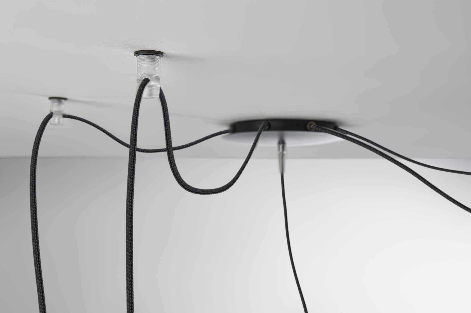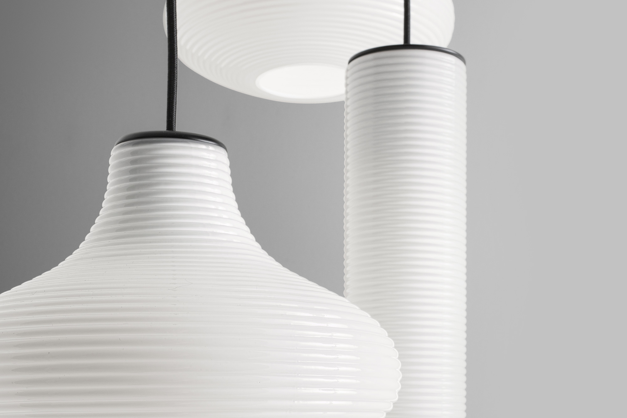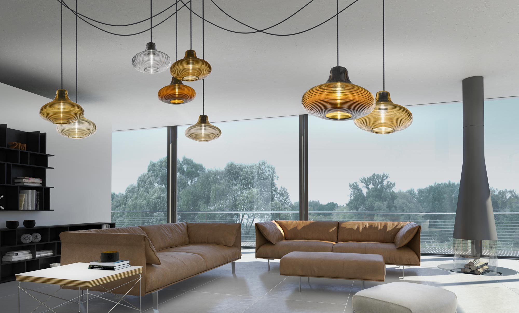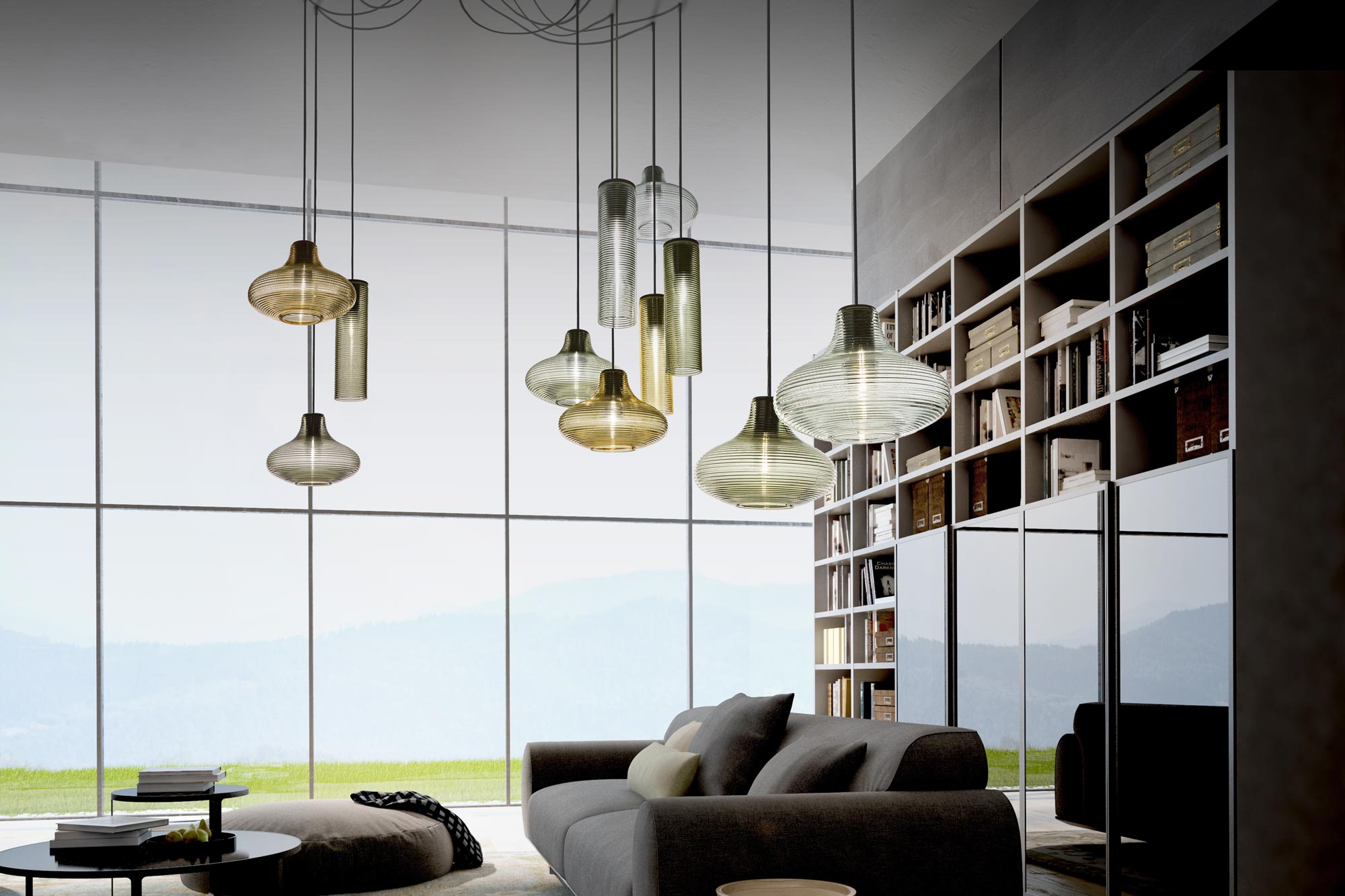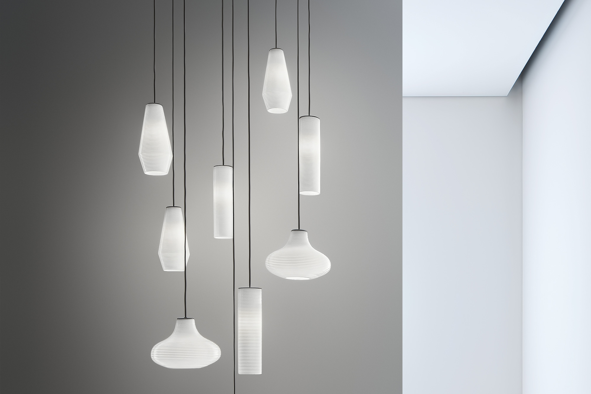 Lampada a sospensione in vetro soffiato con particolare finitura a coste dal gusto retrò. Rosone in metallo rifinito con vernice poliacrilica in color nero o nella nuova versione ottone satinato. Emissione di luce diffusa con attacco E27 e lampadina LED con filamenti a vista inclusa. Vetro soffiato disponibile in 7 colorazioni: cristallo, acciaio, ambra, bronzo, tabacco, verde e bianco lucido. Cavi elettrici in tessuto nero con possibilità di personalizzarne la lunghezza. Rosone a 8 uscite (+1 centrale). Ideale per strutture hospitality o zone living residenziali.