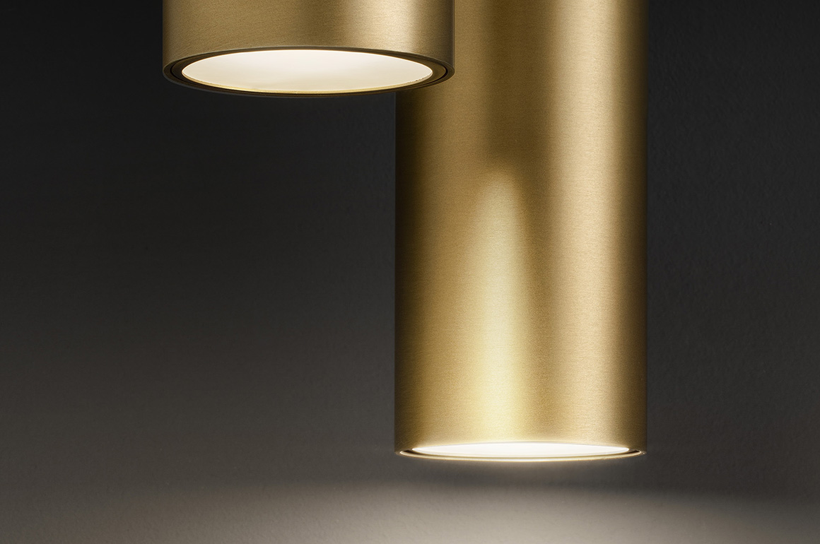 Lampade LED da sospensione e soffitto in tubo tondo di alluminio nei colori: bianco, nero, bronzo, ottone satinato e foglia oro.