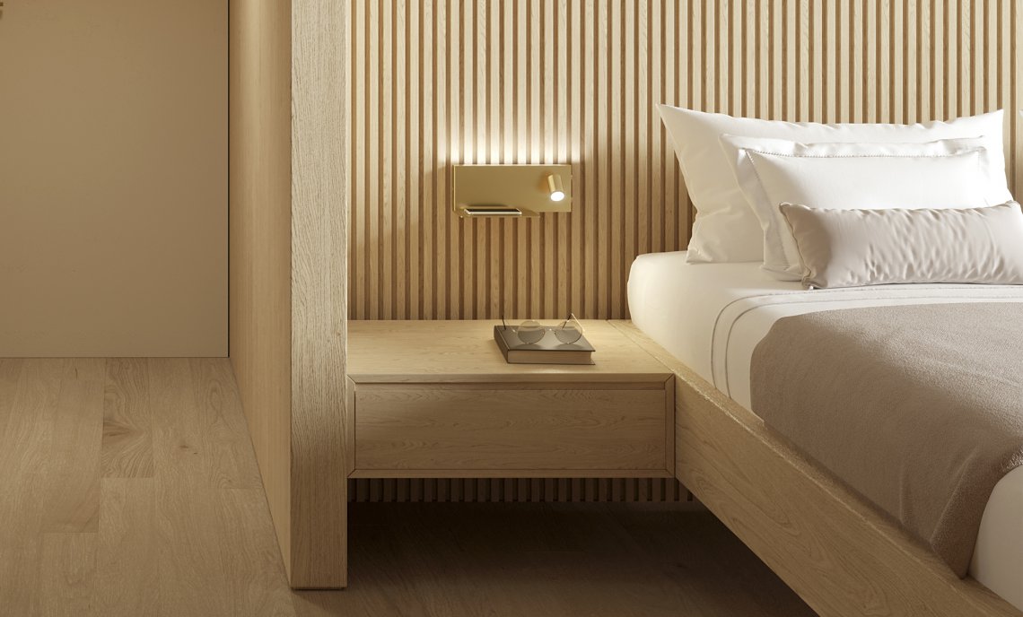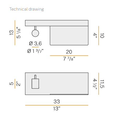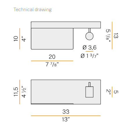 Wall mount fitting for bedrooms with indirect diffused light and adjustable reading light, in warm white. Available in two mirrored version for positioning on left-hand side and right-hand side of the bed, it showcases a shelf with a USB power outlet for charging batteries of electronic devices such as smartphones. Supplied with integrated ON-OFF drivers, it showcases a double switch for separate control of the courtesy light and the reading light. Available in finishes white, black, bronze, mat brass, titanium.