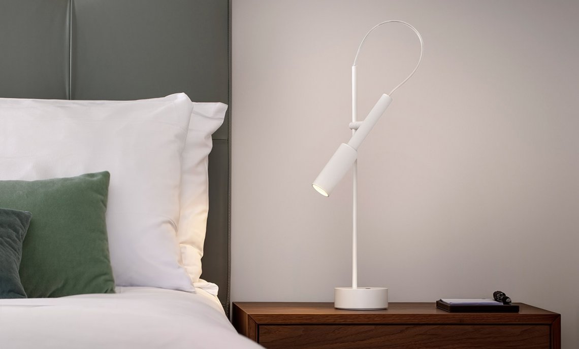 Suspension, table, wall / ceiling (also available as recessed) and floor lamp in turned aluminium with ON-OFF ignition and transparent cable. Tubino wall / ceiling can be easily applied to the bedhead, both in residential and hospitality projects. In the floor version the lighting sources double, the positioning on the stem structure is designed to allow an use also as a reading lamp. The table version is also available as Tubino plus with Step DIM control and 5 light intensity settings. Champagne bronze and titanium finishes with fabric colored cable between the head and the structure.