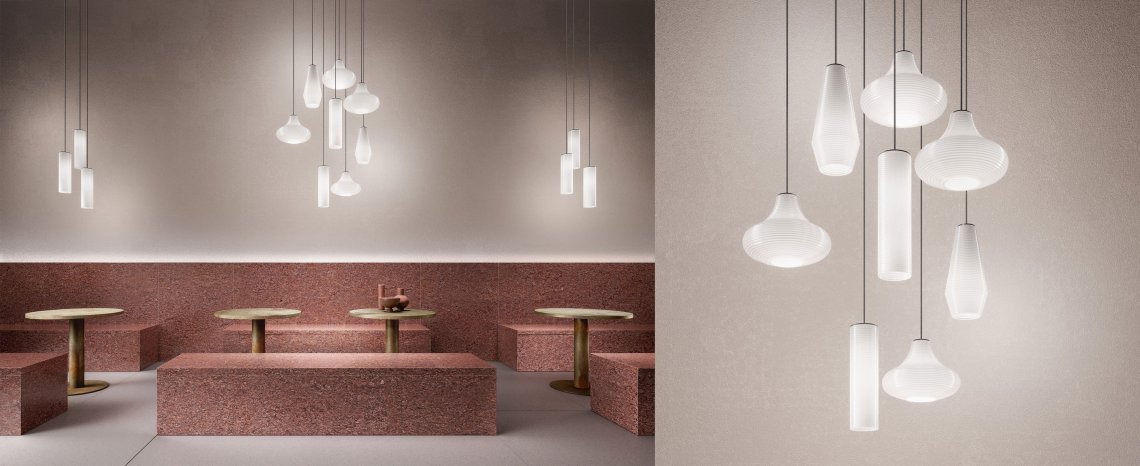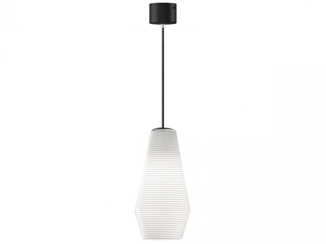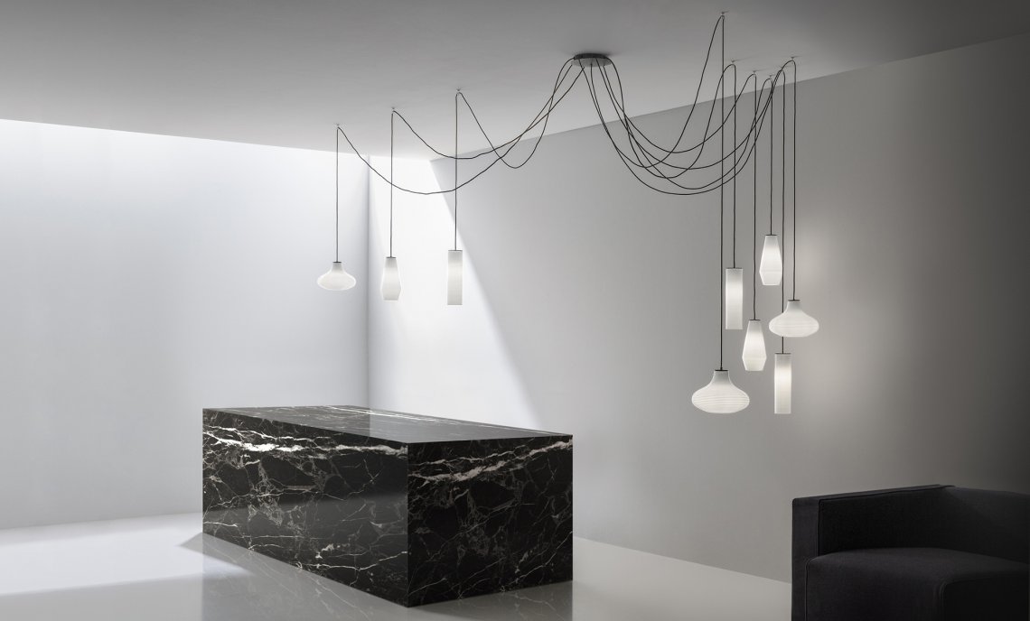 Suspension lamp with shaded blown glass with a retro style. Ceiling metal canopy in black polyacrylic paint and in mat brass. Diffused light in LED bulb E27 distinguished by visible filaments. Seven colors glass available: crystal, steel, amber, bronze, tobacco, green and glossy white. Black fabric electrical cables and possibility to customize the lenght. Canopy with 8 outputs (+1 in the center). Ideal for hospitality or residential facilities.