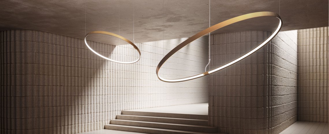 Horizontal suspension lamp in extruded curved aluminum, with opal polycarbonate screen. Emission on the internal side provided by LED modules with ZigBee technology integrated into the canopy. Polyacrilic paint white, black, titanium, bronze and mat brass finishes are available. Ideal for residential spaces and living areas.