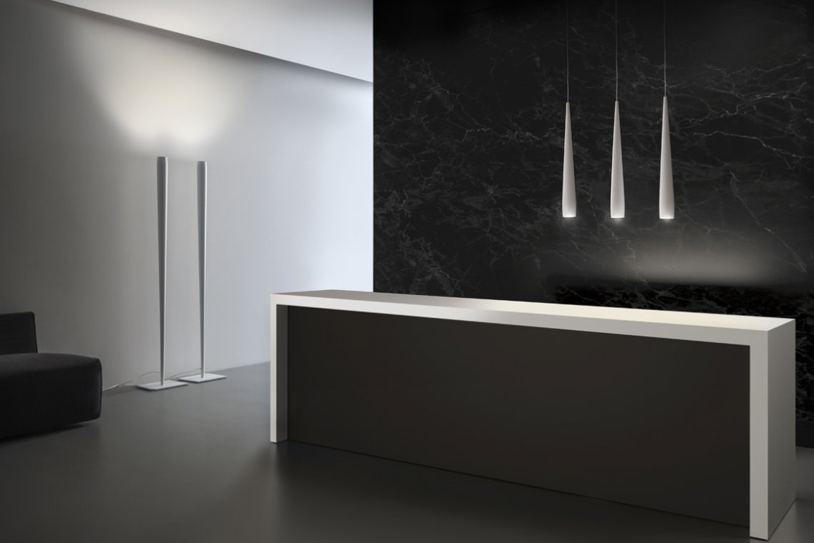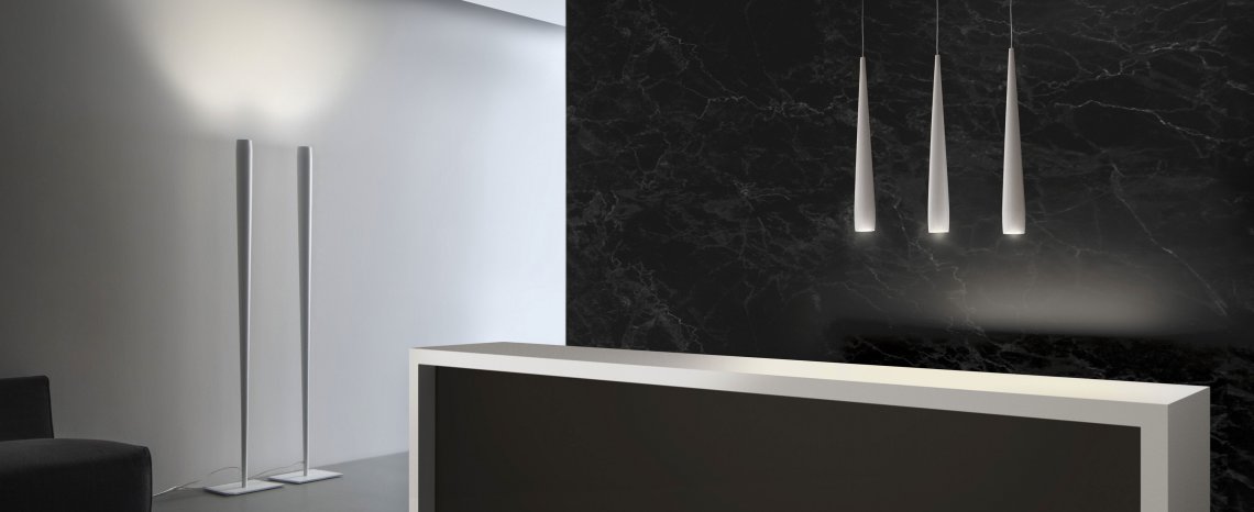 Floor and suspension lamp in tapared metal white, black, mat brass, gold leaf and titanium. On request silver leaf.