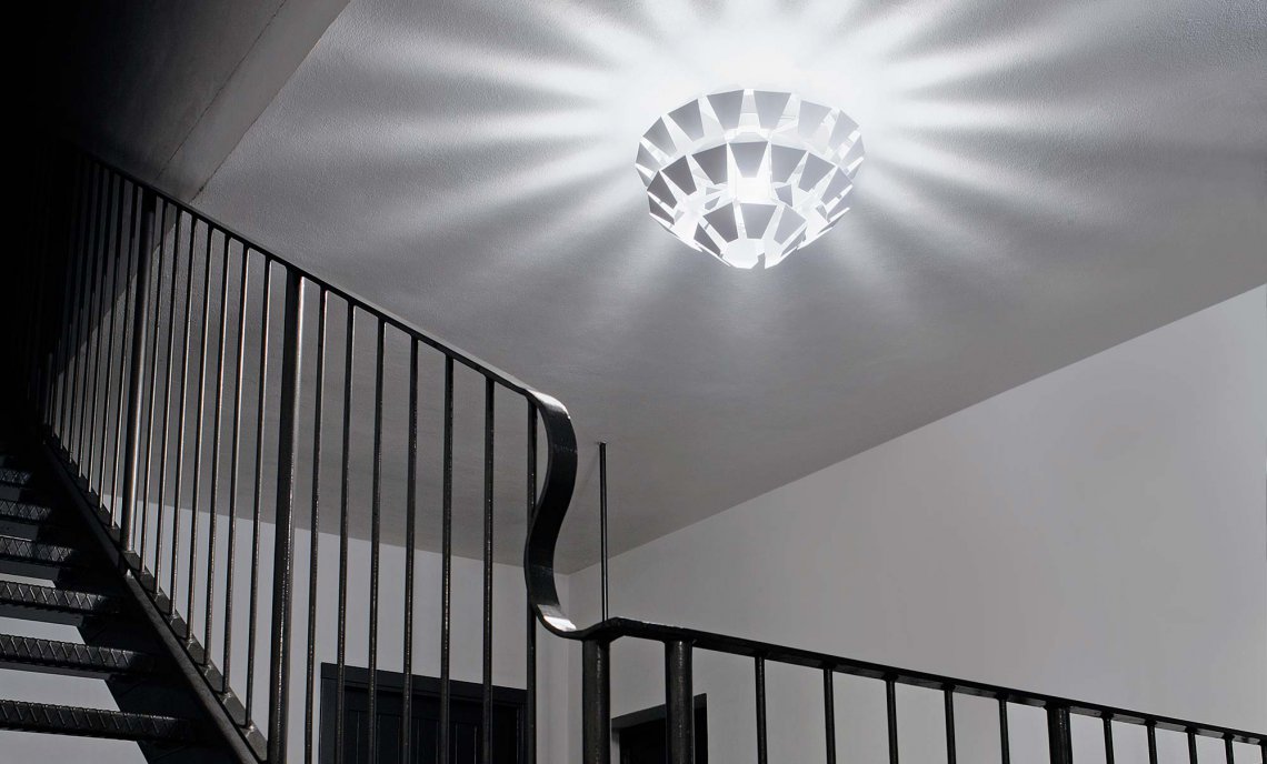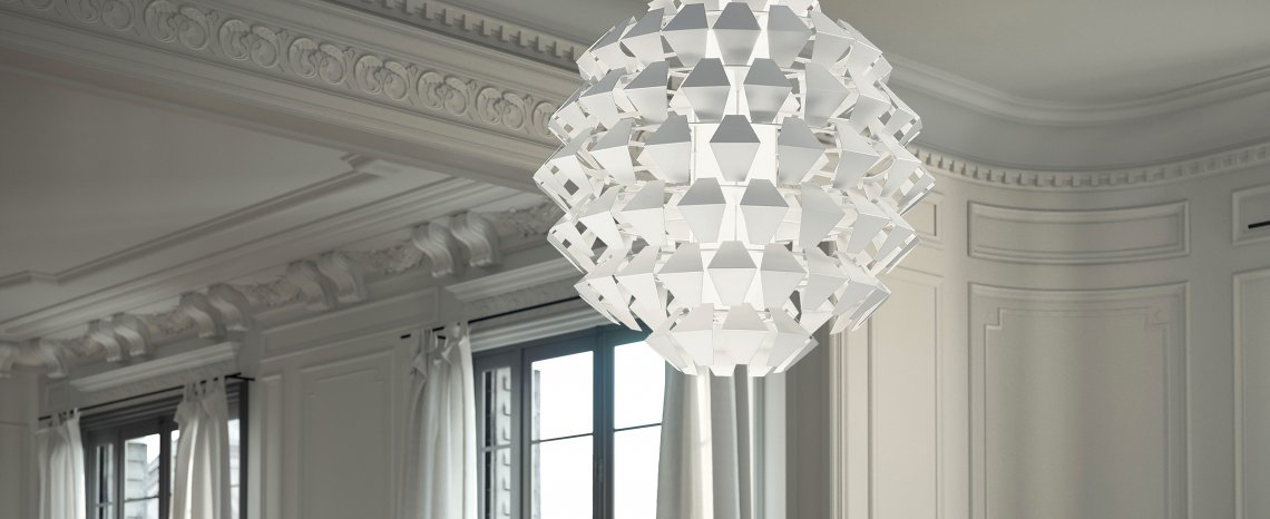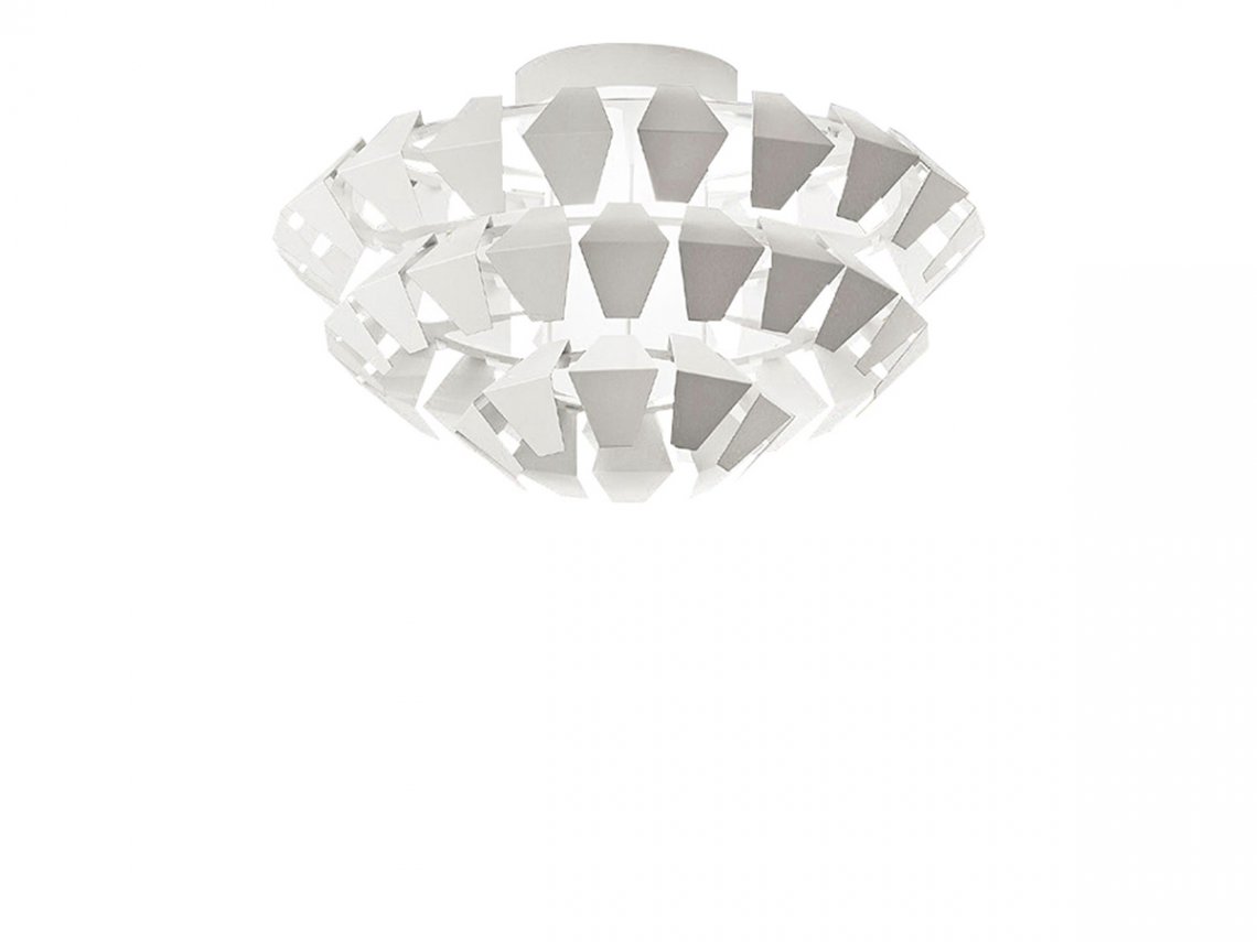 Suspensions, ceiling with pieces of white painted metal. On request gold, silver or copper leaf. Mat glass diffuser.