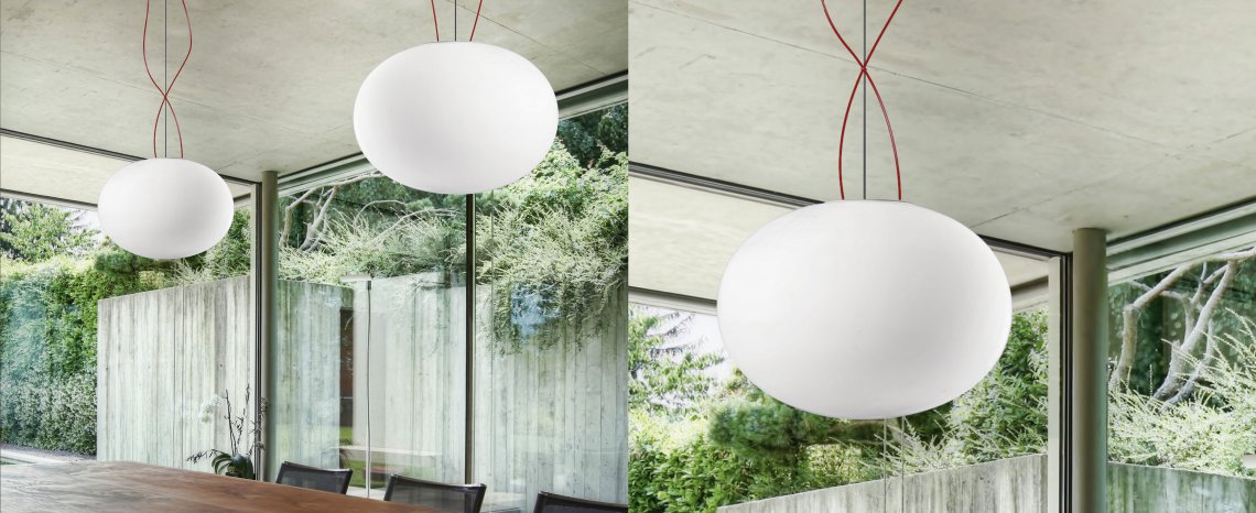 Suspension, table and ceiling lamps in blown opal glass. Metal frame in white polyacrilyc paint. Diffused light provided by different light sources (LED, G9, E27). Perfect and homogeneous distribution of the light, without any shadow. Ideal for residential use or for lobby areas in multiple compositions.