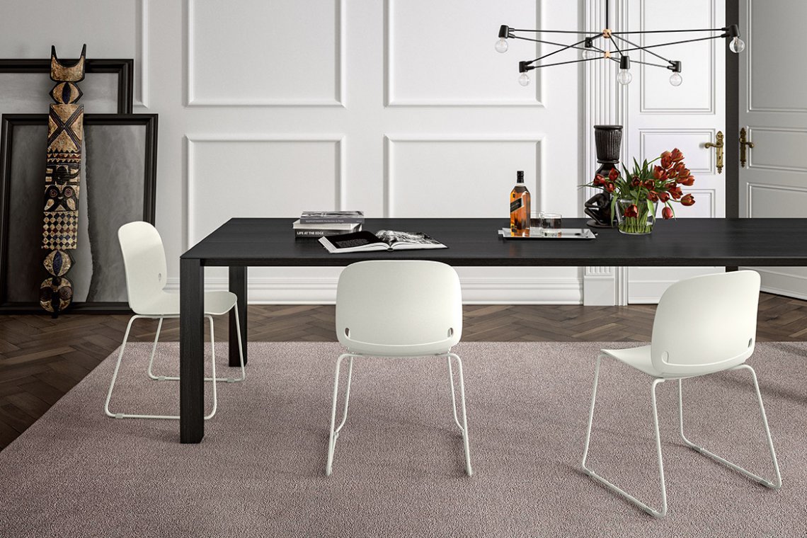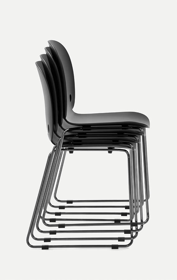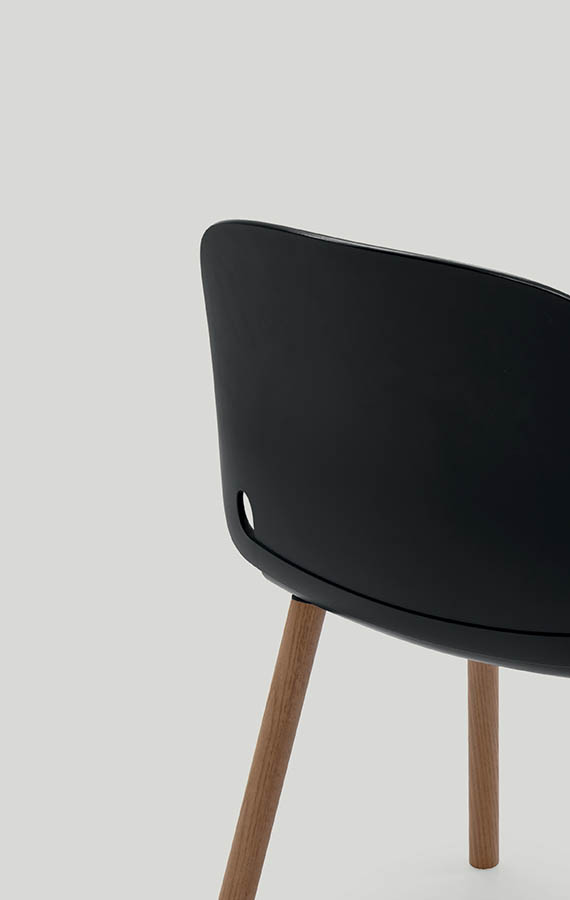 Intro as in “introverted,” from the idea of a person discreetly folding his hands behind his back. The essential design expresses a specific character: the base with its slender lines supports a comfortable seat, welcoming, soft to the touch. Seen from behind, the back displays the folded arms that provide a handy grip for lifting and moving the chair. The stackable structure permits optimization of spaces used for entertaining guests. Thanks to its form and the characteristics of its materials, Intro is also an excellent choice for any space in the home.