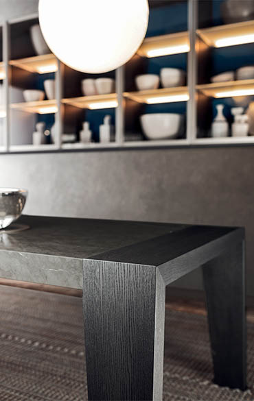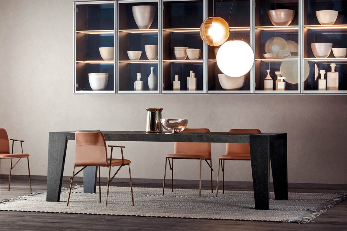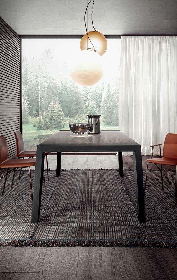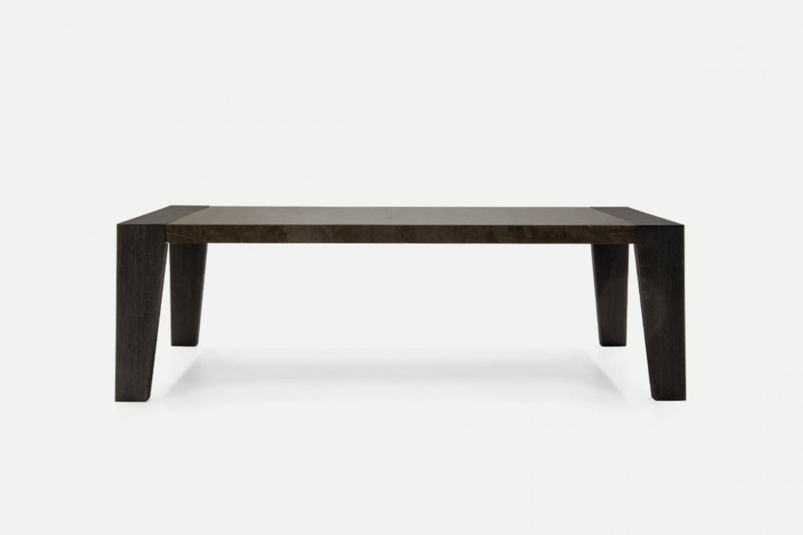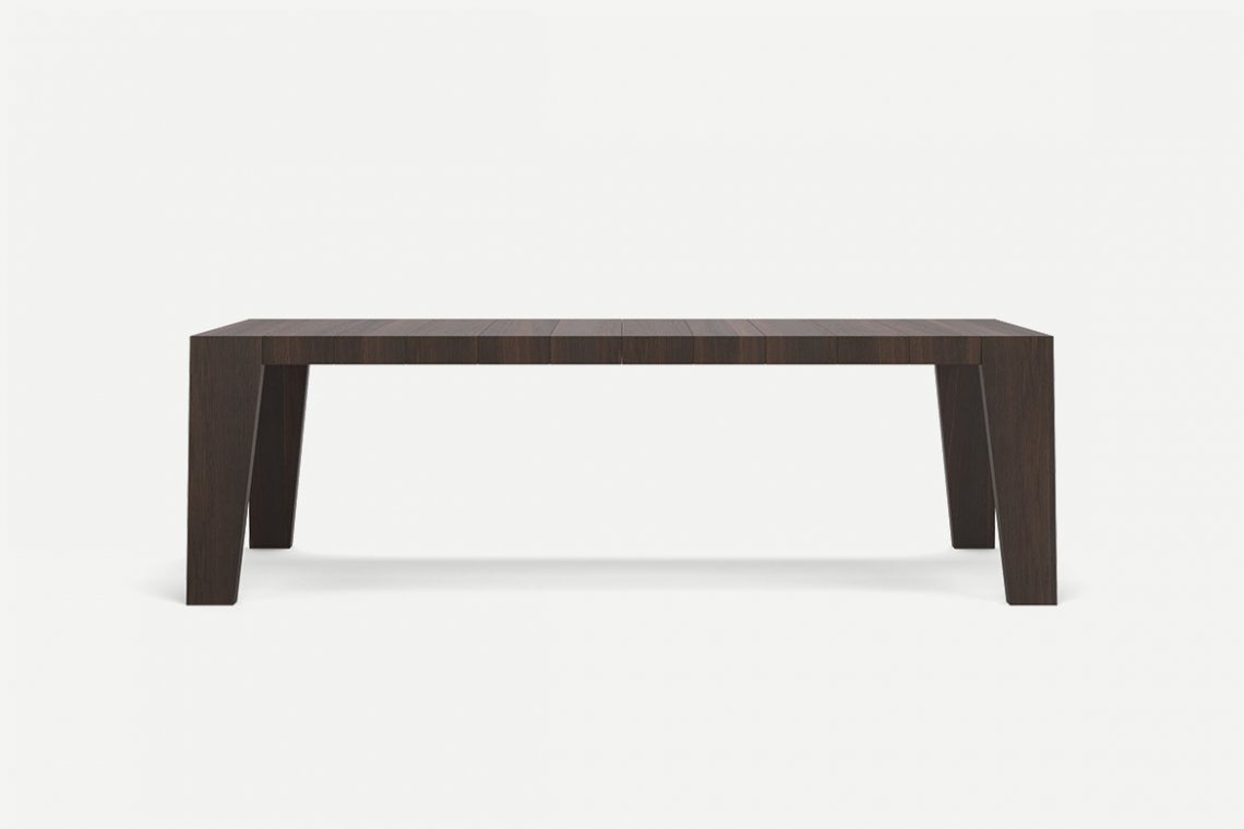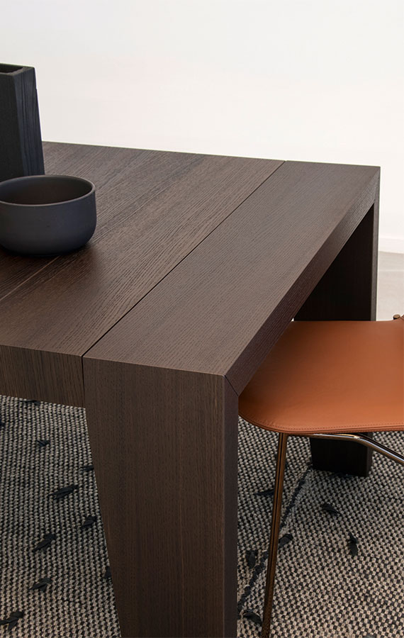 Sturdy, sculptural and extendable: Cartagena is a table that furnishes while offering versatility and functionality. The base, top and the extensions hidden away inside the table are made entirely out of wood which is engraved to achieve a slatted effect. The design of the legs, tapered towards the bottom, is clean-cut and modern. The top and base are joined elegantly and seamlessly through the sides which are enhanced by this interesting detail.