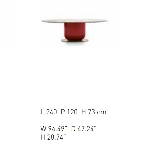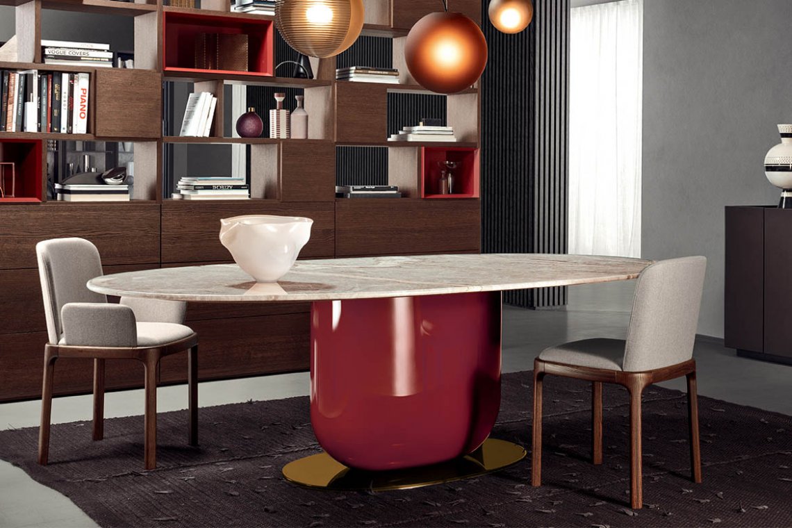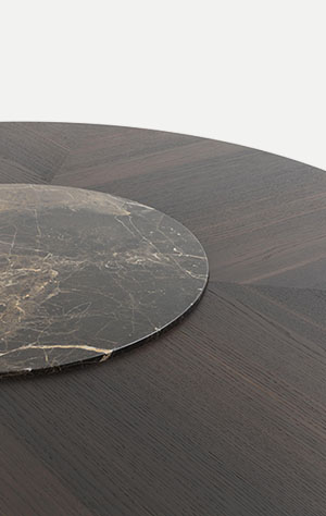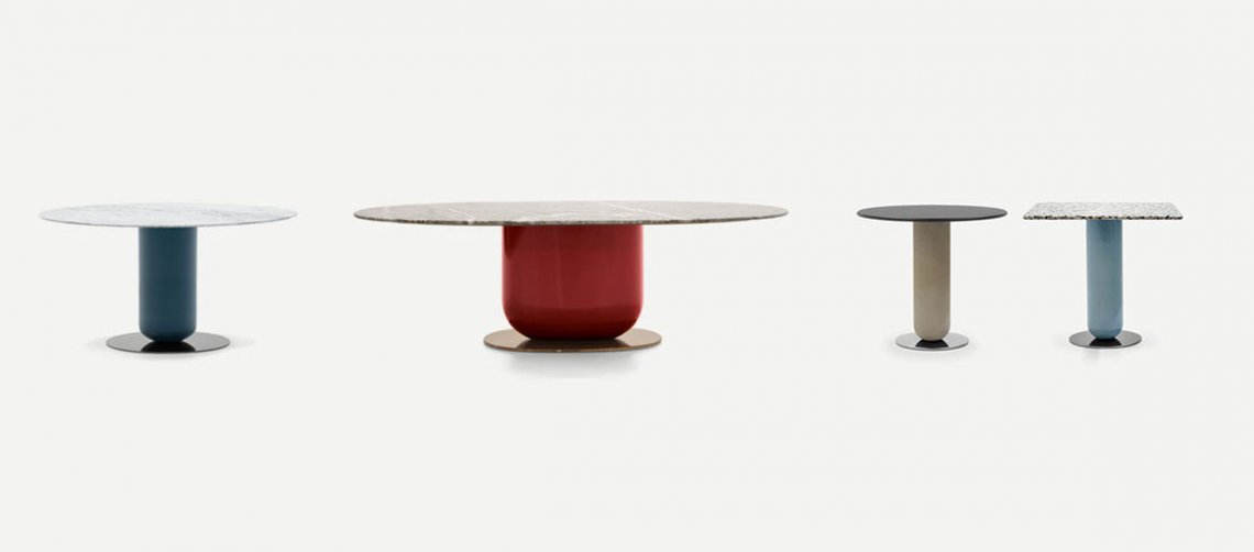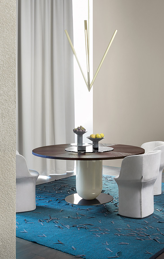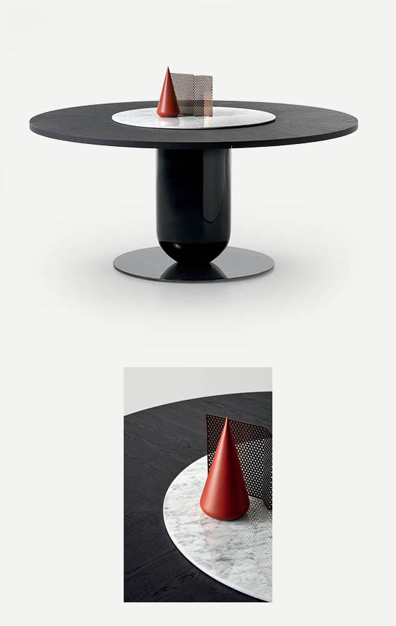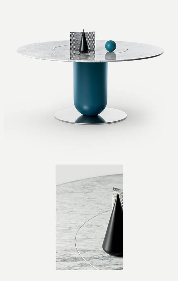 culptural, symbolic, bold: the table stem from a desire to have fun assembling three classic, primary, geometric elements in an ironic way. Ettore pays homage to master designer Ettore Sottsass, a visionary pursuer of design that would break the traditional aesthetic rules, going beyond the purely ornamental and venturing into the realm of emotional, social as well as aesthetic experimentation. The intention behind the Ettore table was to pay tribute to this philosophy and to aggregate, surprise and stimulate. The central leg, monumental in size, tapers at the base to produce a lighter look and suggest an ironic contrast between the parts and an unexpected effect, fooling the eyes into believing it doesn’t touch the ground. The effect is emphasized by the choice of materials: the shiny metal of the plate forming the base reflects the leg, producing the illusionary impression that the table is suspended and precariously balanced. Going back to their childhood, Calvi Brambilla drew inspiration from the playful principle of the roly-poly toy. The two designers successfully paired the idea of the toy with the vision espoused by Pianca, champion of an elegant, pared-back language punctuated by premium materials and finishes.
