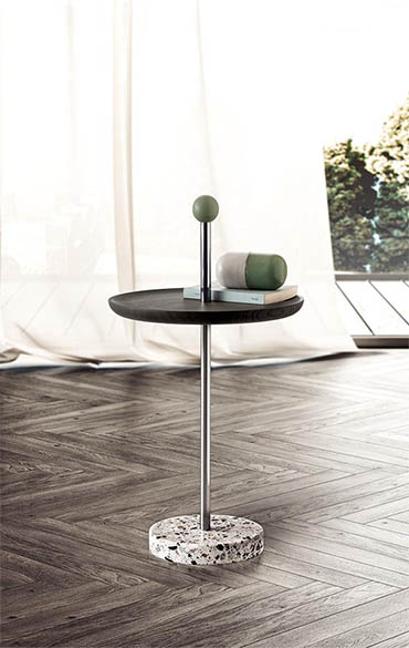 A collection of functional and elegant accessories, Contralto wears its pared-back, linear look as a distinguishing feature. The series comprises mirror, side tables and valet stands. The latter all share a common specific detail giving them their distinctive character: a terrazzo plinth serving as the base supporting a sleek, slender metal stem that has a series of elements branching off it at the ideal height for practical use. The resulting forms are fluctuating sculptural volumes, often portable, invariably full of life, designed to simplify those little everyday actions. All shelves and set-down spaces are made from turned and smoothed ash to provide a lovely tactile quality and prevent damage of any kind to whatever item of clothing or other object is placed on them, no matter how delicate. These pieces can be tailored to individual requirements, choosing any of the Pianca wood options.