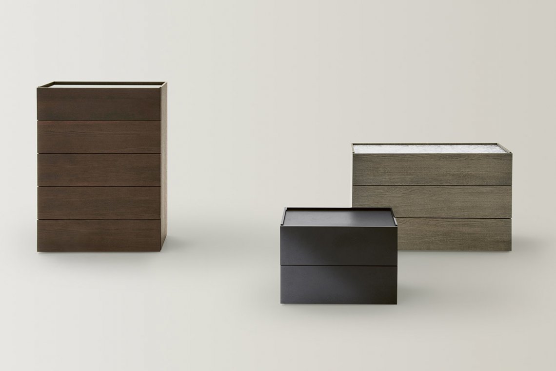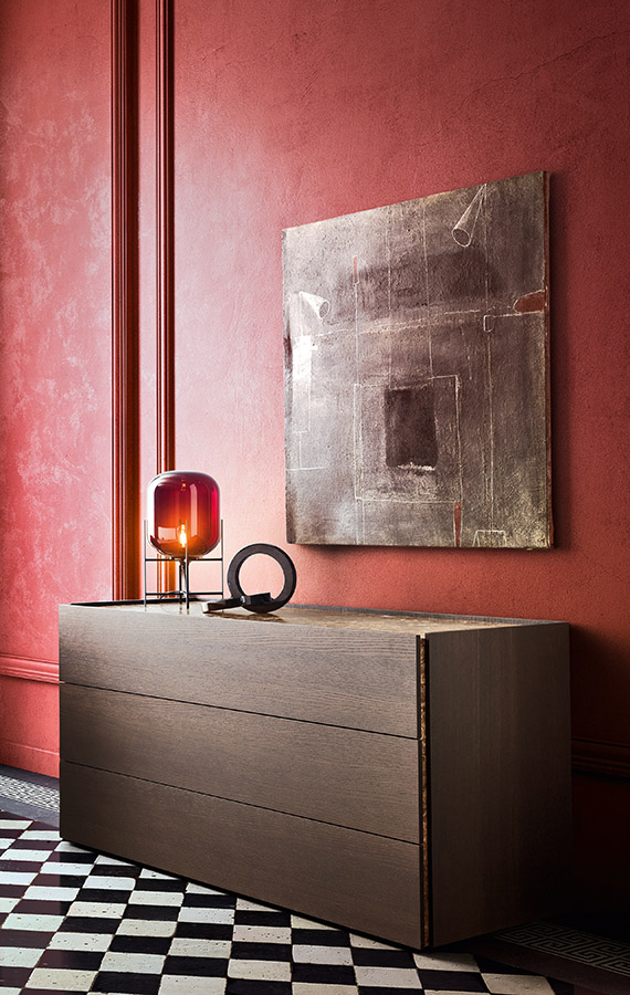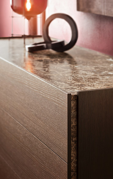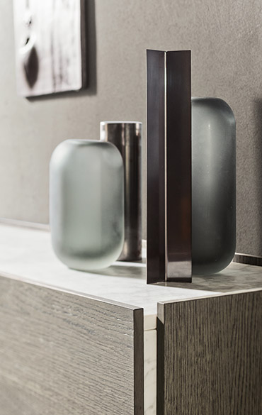 Simple, clean lines combined with precious and sophisticated material details give Atlante its distinctive as well as versatile connotative presence: a line of units with regular and oversized drawers designed to sit happily in the middle of a room and feel at home in any interior. The drawer fronts match the colour of the carcass and have handy finger grips set into the sides for opening. The top and the side trims details make the design truly unique: made from marble, mirros and glasses of collection they create a refined marriage of the classic and the modern, a quality that is clearly expressed in the essentiality of the volumes.