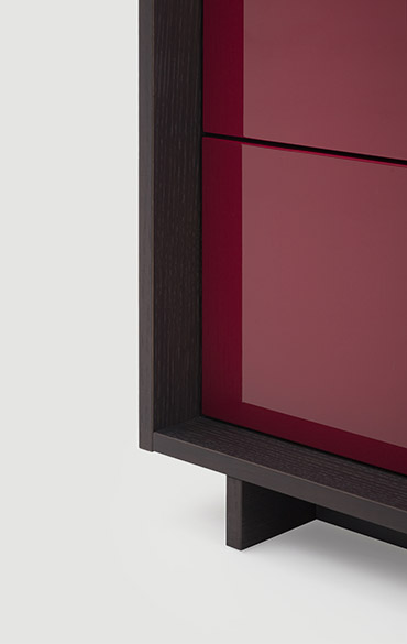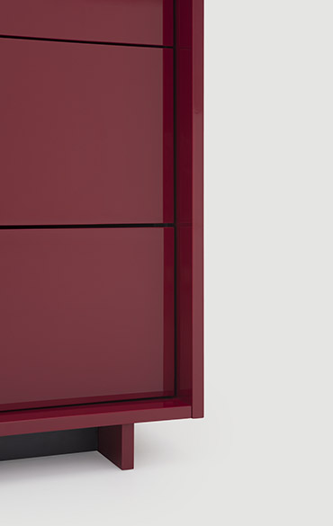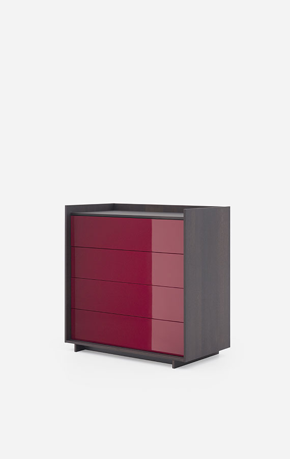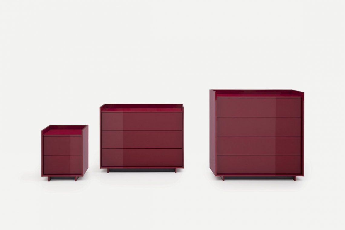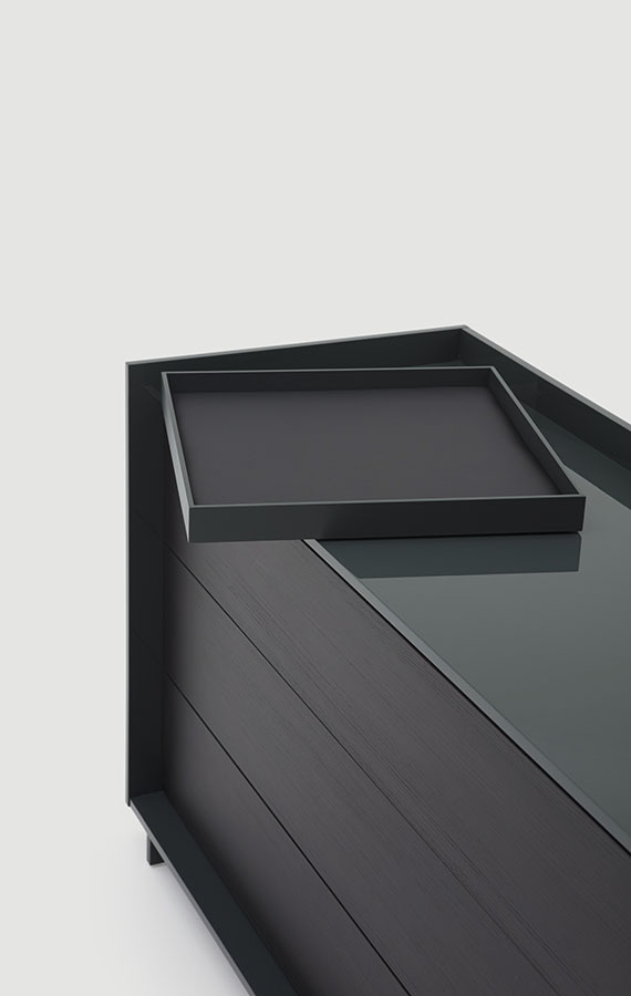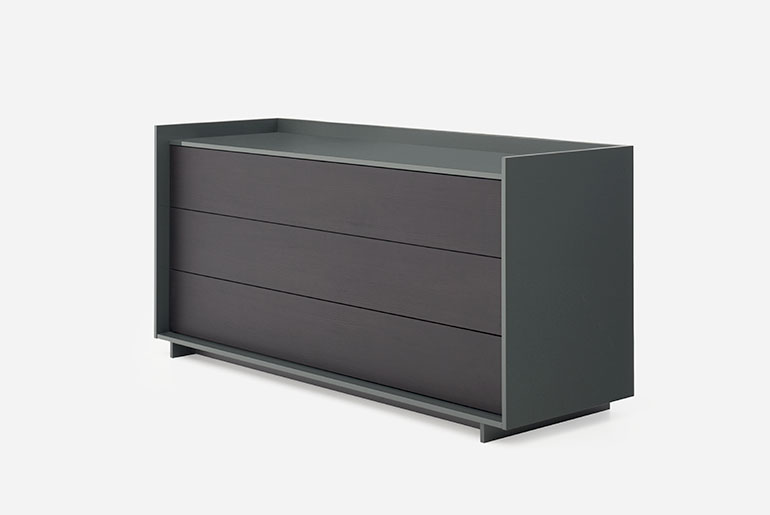 Essential things are never superfluous. The complements of the Kyoto bedroom set, the dresser and bedside table, are the result of the study of the absolute section between corner and straight line, in a measured composition of surfaces. The outer frame, more pronounced and deeper, encloses push-pull opening drawers, defining the entire volume of the structure ith stark gracefulness. The top transforms into an open niche, a discreet, elegant support surface, where you can add a further complement: a tray with an synthetic leather-covered base for storage of personal items and jewellery, which fits neatly inside the profile of the top. The cantilevered base floats, creating a void which surrounds the elements, giving them a sense of impalpable lightness.