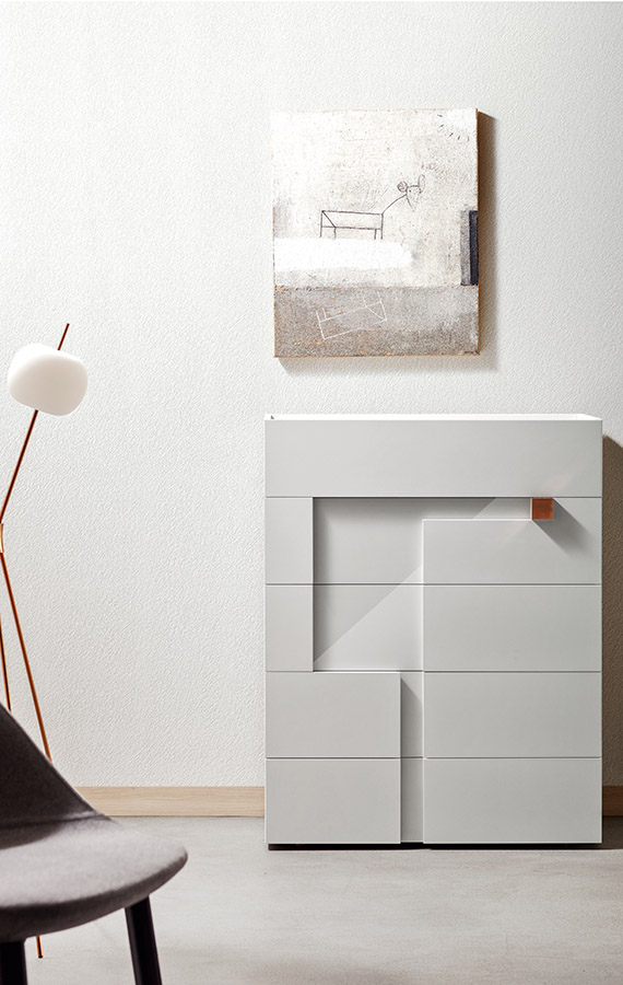 Logos is a family of containers for the bedroom area, result of the the prestigious collaboration with the Calvi Brambilla studio. The front part of the modules is a composition of offset, overlaid inter-communicating elements, an homage to artist and designer Bruno Munari, who conducted a lengthy study of the spatial effects deriving from placing coloured surfaces together. Contrasting colours can be used on the outside and inside surface, combining to create different looks that can range from playful to elegant according to individual tastes. The unusual geometry of the surfaces allows you to grab the square in your hands in order to enter into it, in an ongoing interaction between two and three dimensional spaces.