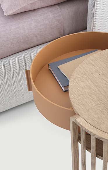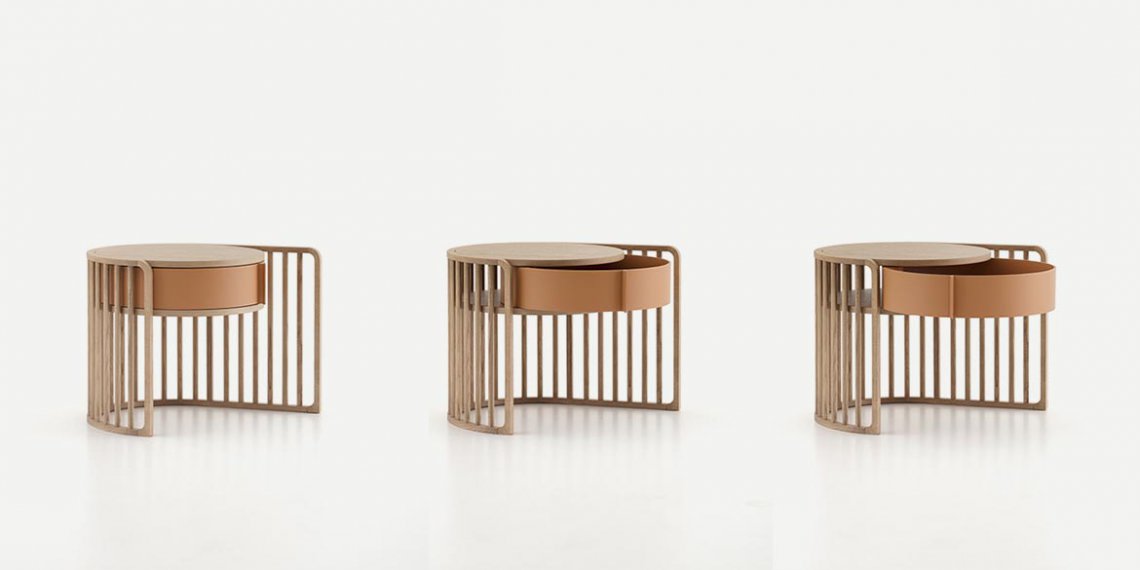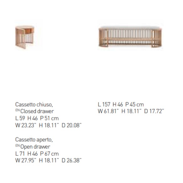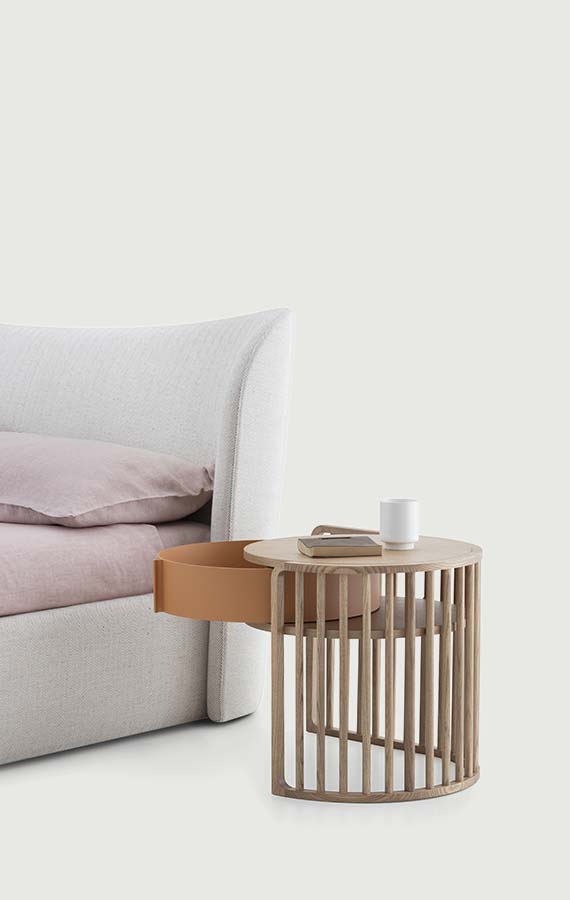 The rustling of the wind echoes in the silence of nature: a visual reference to canes, creating light, evocative and reassuring pieces of furniture. The new Palù collection portrays a concept of small-scale architecture, formed from the relationship between presence and absence. The distinctive features of these complements, a bedside table and bench seat, are the linear effect of solids and empty spaces, and profound harmonies. The curves created using a sequence of wooden rods define the space, indicating the sense of the limit in a neat and feminine series. The frame embraces suspended volumes, made out of air: an upholstered seat, a Vienna straw shelf, elegant drawers. In the bedside table, the round drawer rotates towards the bed, transforming into a second shelf.