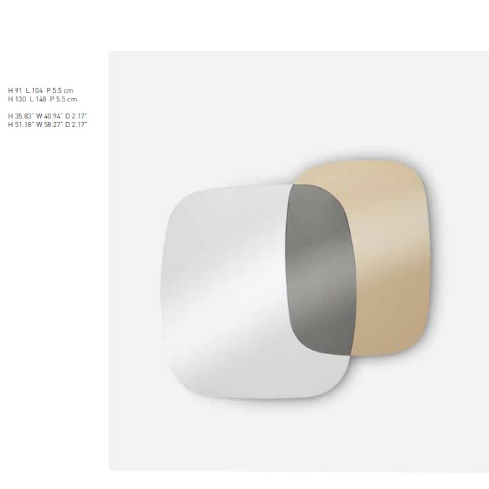 Oltre plays with layering, with the idea of repetition, going beyond, featuring overlapping shapes that are similar in geometry but differ in their proportions. Soft edges, accentuated curves, which heighten the boldness of the design, pursue the harmony of the parts and of the whole. The basic structure is a mirror supported by a black wooden rear panel. The piece is the sum of a dialogue between three mirrors: sylver, smokey and lead metalized. It comes in two sizes, both generous and designed to emphasize its sculptural quality.
