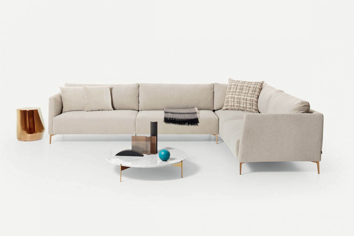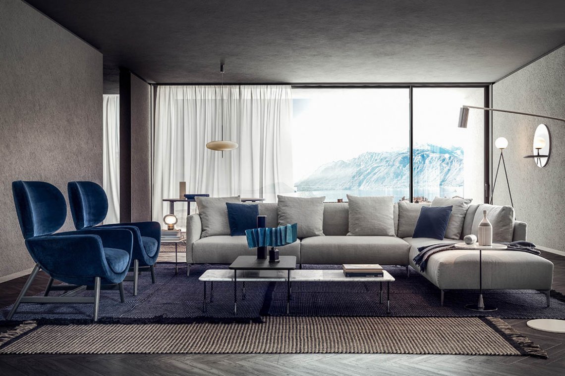 Eye-catching lightness. With its slender, feminine looks Volo reveals a minimalist, elegant design achieved through a refined game of subtractions. The one-piece structure gives the cushions a minimalist, refined appeal enhanced by slim feet available in all the collection’s metallic finishes. Ample seat and back volumes contrast with slim armrests. Headrest cushions with an original, teardrop-shaped profile are available on request for exceptional comfort.