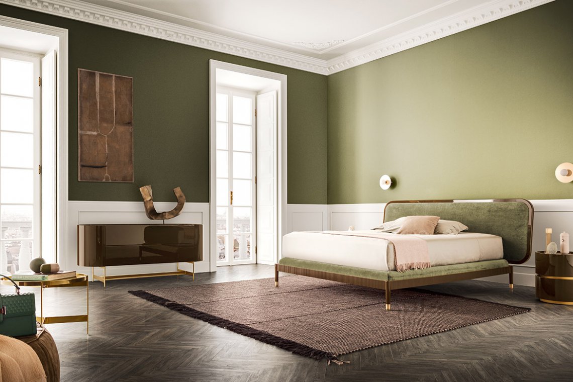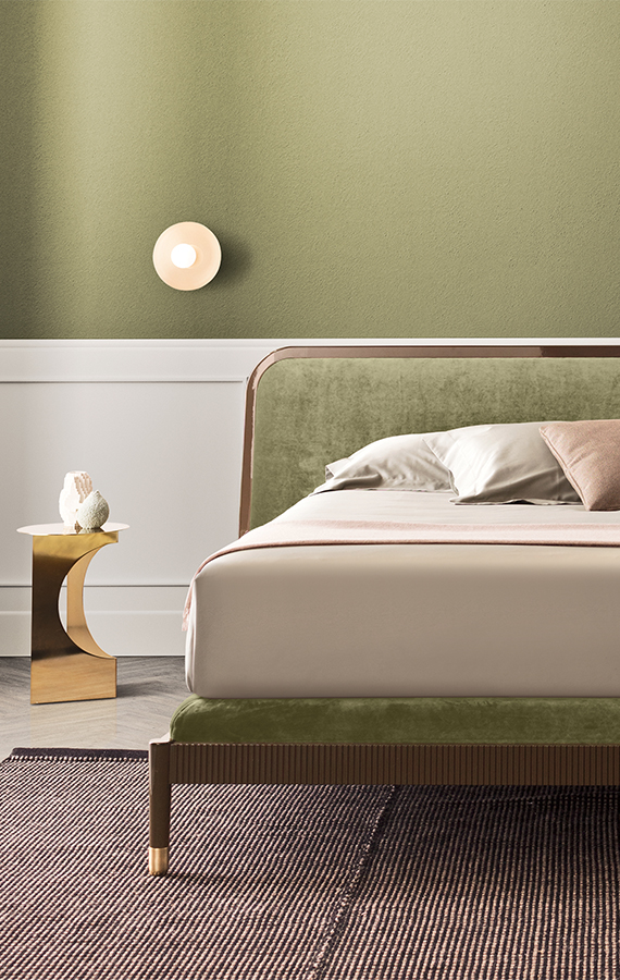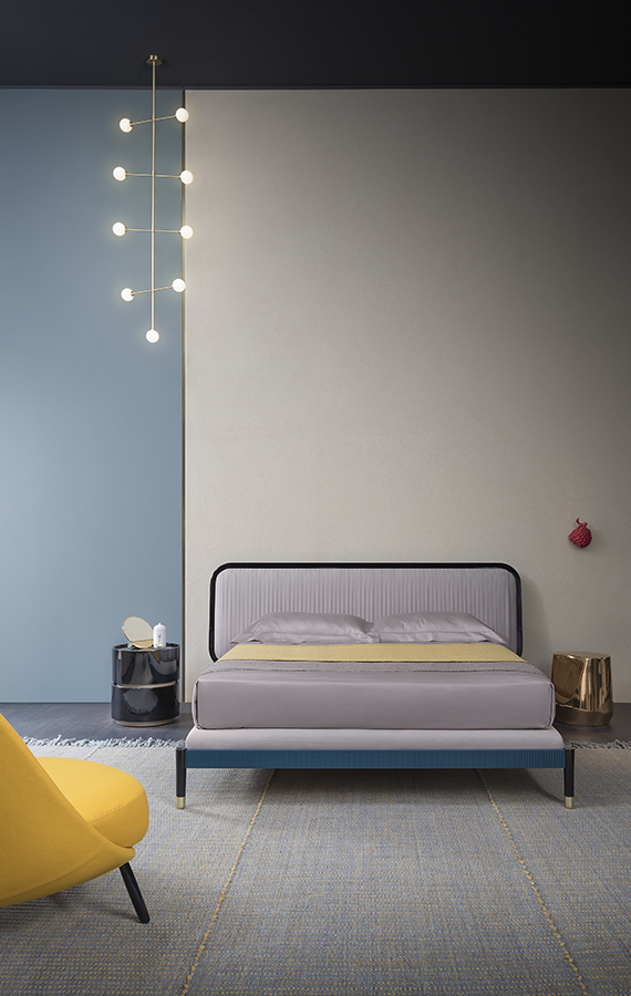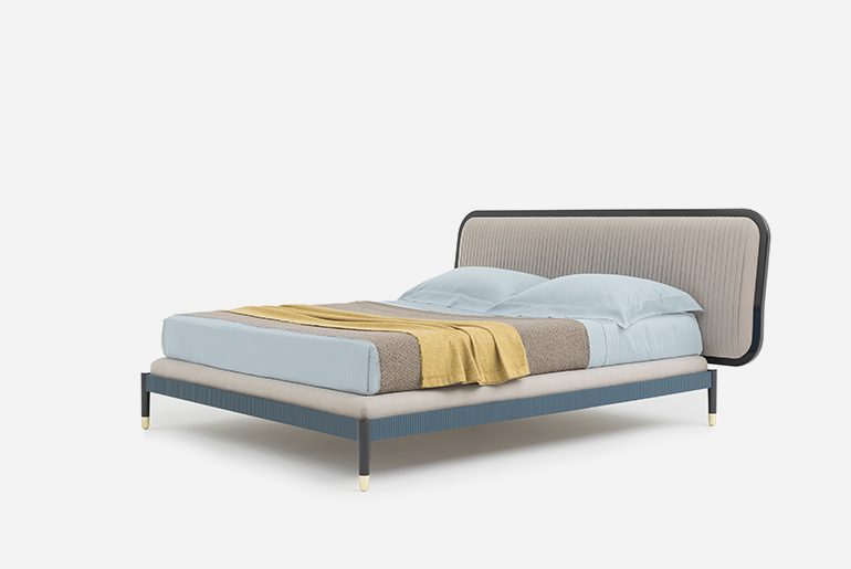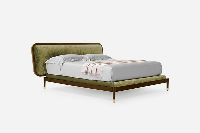 Inspired by a classic style with a contemporary appeal and linked by a brilliant design that definitely doesn’t go unnoticed. Traditional charm comes together using a topical, refined aesthetic language with vintage undertones. Light volumes, precious and significant finishes – such as the hand-pleated headboard finish – make this model equally elegant and majestic in the plain-headboard version as well. The graceful bed frame rails are in fluted, lacquered wood and accommodate the soft, padded frame of the bed base.