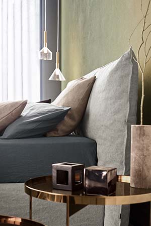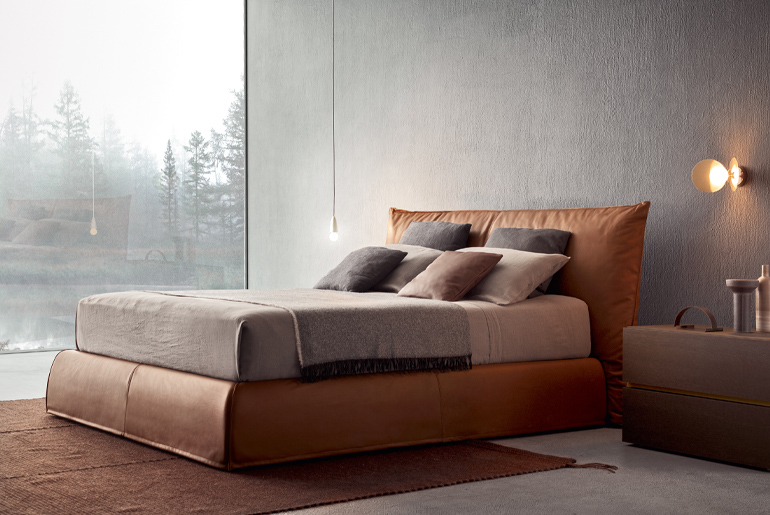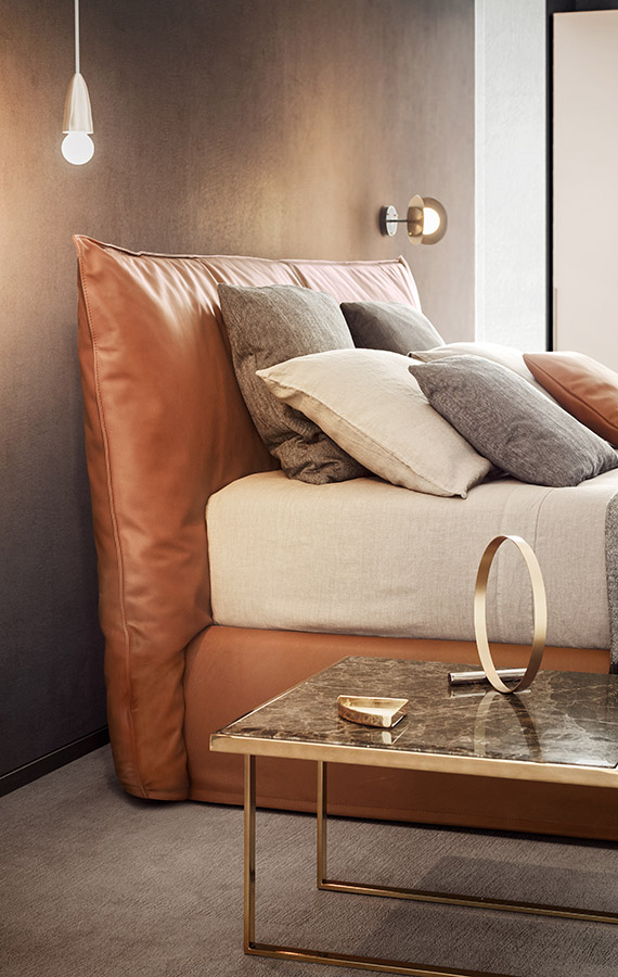 The cosy warmth of a comfortable nest: generous, wraparound volumes suggest total relaxation. Harmoniously punctuated by a vertical rhythm, this bed’s proportions express themselves to the utmost degree in the headboard that embraces the entire height of the bed frame. The large, one-metre high cushion with its generous feather filling is a soft support for the head and back. This bed is available in the divan version, padded and upholstered in removable fabric, leather or man-made leather.