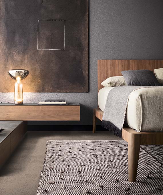Symmetry and simplicity create a reassuring yet eclectic design. Clean-cut volumes, seamless surfaces, slim and rounded profiles are part of an expressive language that communicates solidity and modernity. The feet, resembling elegant, slim heels, become fascinating distinctive features. For a warmer, more sophisticated version, the headboard and bed frame can be upholstered in fabric or leather. Even the bed’s frame can be customised in many ways: it is available matt lacquered as well as in wood.