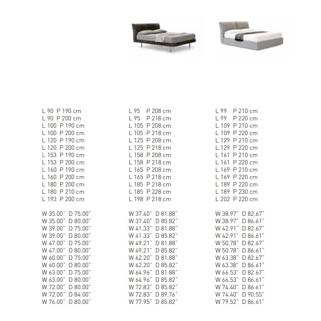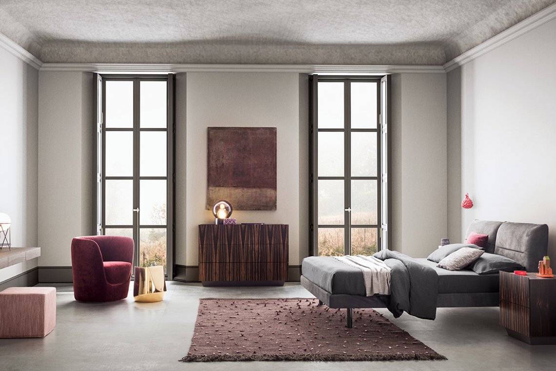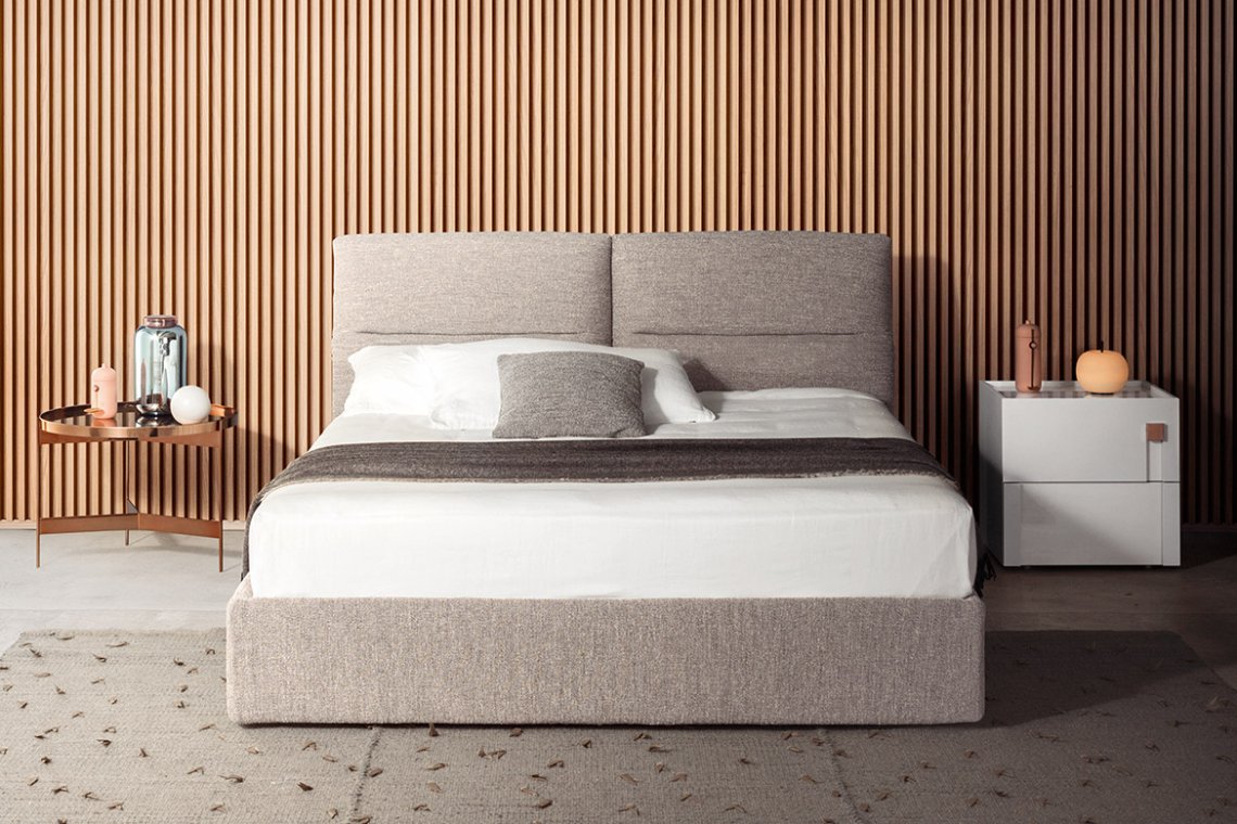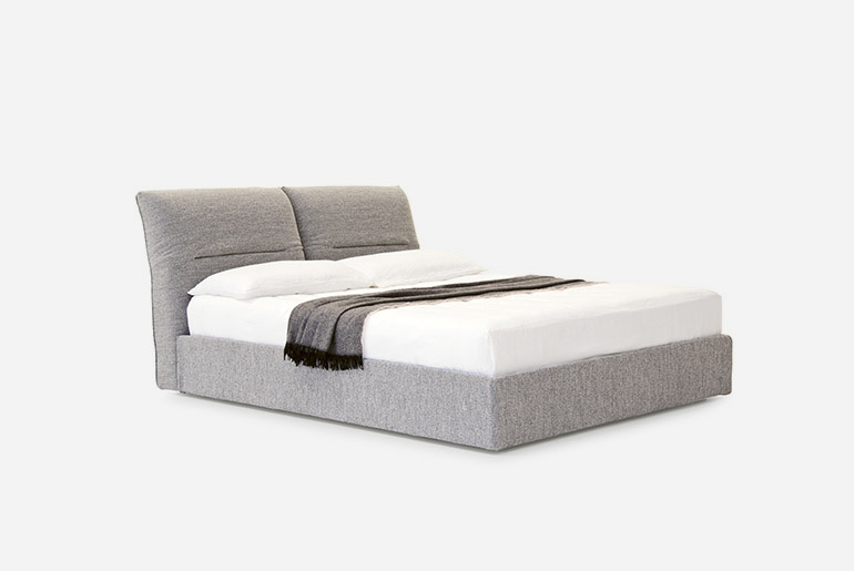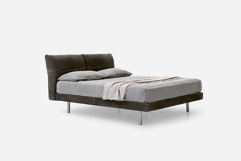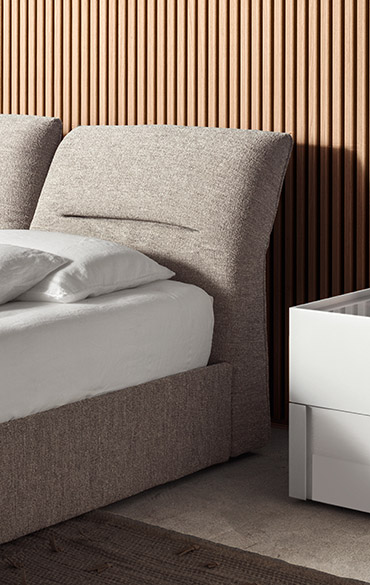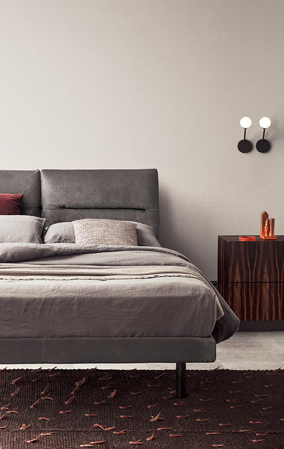 Elegance embraces comfort in a bed that makes everyone happy. Soft volumes, moderatelysized proportions, minimalist aesthetics, this design acutely pairs versatility with usability. Its distinctive feature is the double, reclining headboard made up of two, independently-adjustable cushions. There are two options for the base which can be fitted with feet or offered in the divan version. In both cases, the bed frame can be padded and upholstered in fabric, leather or manmade leather.