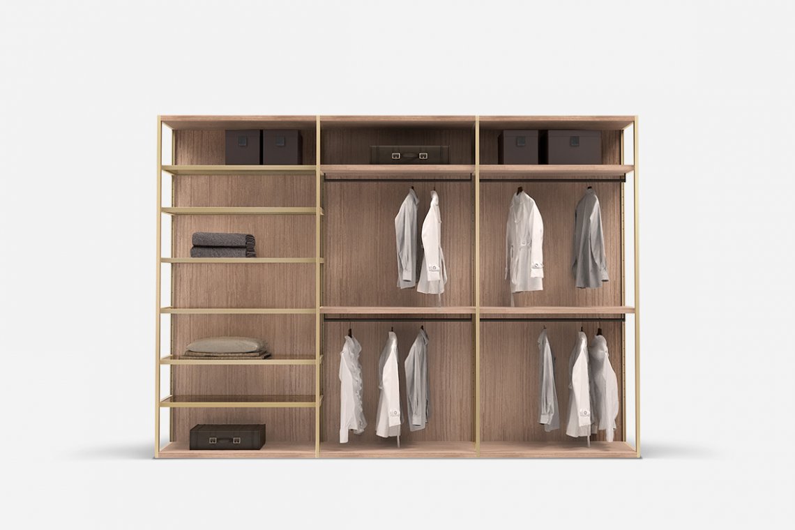 Transparency, lightness, linearity. The new Teatro walk-in closet was designed to create a subtle frame for everything it contains. The essential, elegant supporting structure becomes a visible, distinctive geometric form, perfectly suited to any environment and style. The passing frame dividers, with no interior panels, ensure visual and spacial continuity, emphasising the lightness of the architecture. The free-standing structure allows the walk-in closet to be fitted against a wall, without anchoring, or in the centre of the room, making Teatro a window display or an island, suitable not only for private spaces, but also contract spaces. Adding back panels, side panels and doors in transparent or reeded glass gives plenty of scope for a custom design, whatever the style and functional requirements.