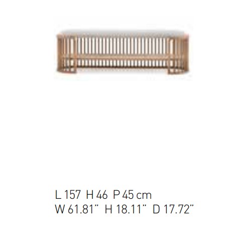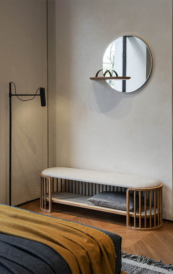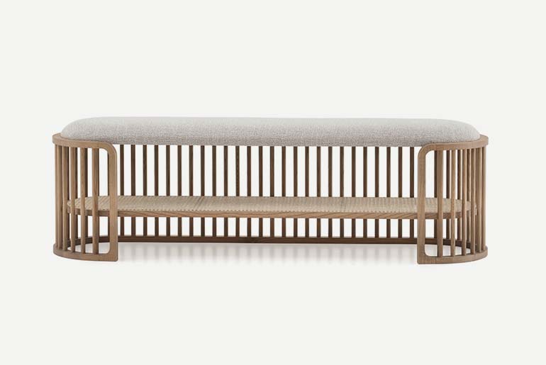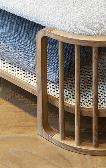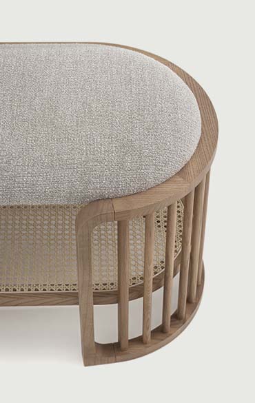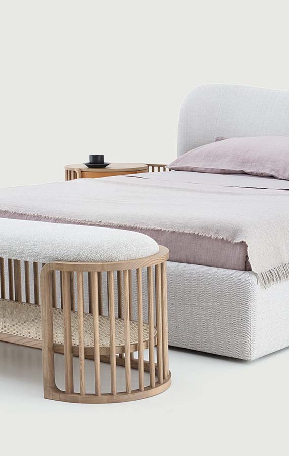 The rustling of the wind echoes in the silence of nature: a visual reference to canes, creating light, evocative and reassuring pieces of furniture. The new Palù collection portrays a concept of small-scale architecture, formed from the relationship between presence and absence. The distinctive features of these complements, a bedside table and bench seat, are the linear effect of solids and empty spaces, and profound harmonies. The curves created using a sequence of wooden rods define the space, indicating the sense of the limit in a neat and feminine series. The frame embraces suspended volumes, made out of air: an upholstered seat, a Vienna straw shelf, elegant drawers. In the bedside table, the round drawer rotates towards the bed, transforming into a second shelf.