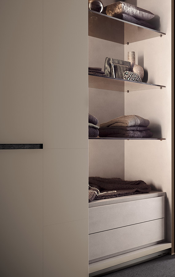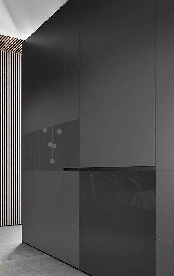 A refined design with a stylish, eccentric appeal. The geometric door decor offers a juxtaposition of gloss and matt glass surfaces. Various-sized rectangles in different proportions stem from a modern artistic language. The handle has a strong graphic impact, cutting across the doors in a horizontal line that enhances the beauty of the composition. Available matt lacquered or in wood, it is recessed inside the panel of sliding or flush sliding doors.