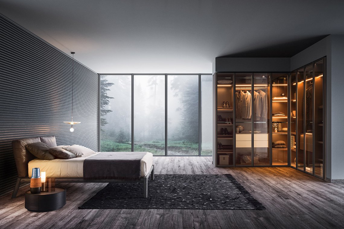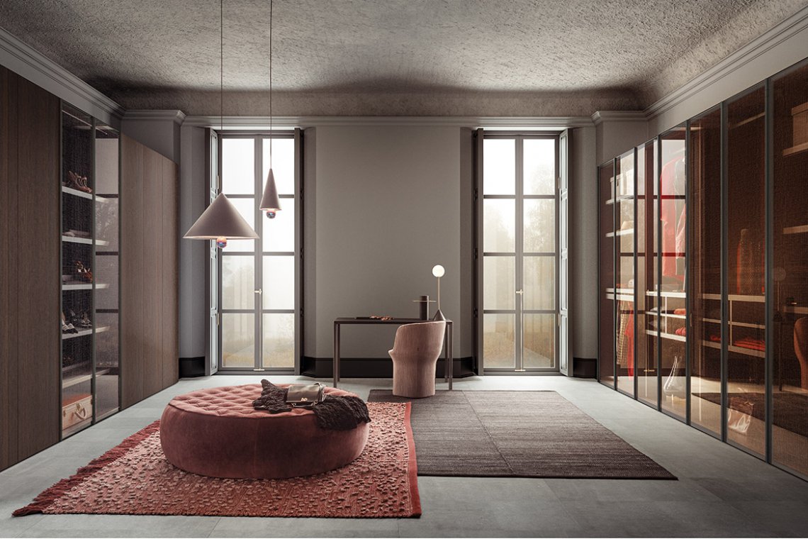 Just as if they were arranged in a personal boutique, your objects and garments must be enhanced and exhibited with elegance and order. The glass doors, defined by a Gunmetal Grey or metallized brown frame, set off and add a finishing touch to arrangements. The visible interior accessories show off their great ability to efficiently organise spaces with style. The hinged doors come with special pivot hinges that can open at a 180° angle.