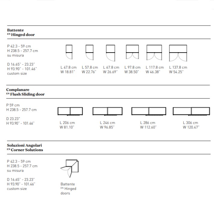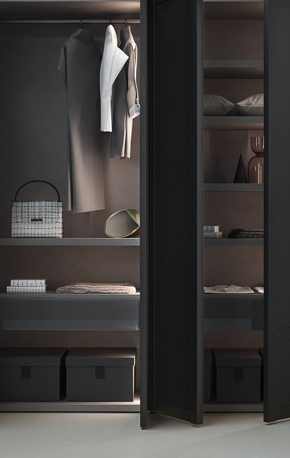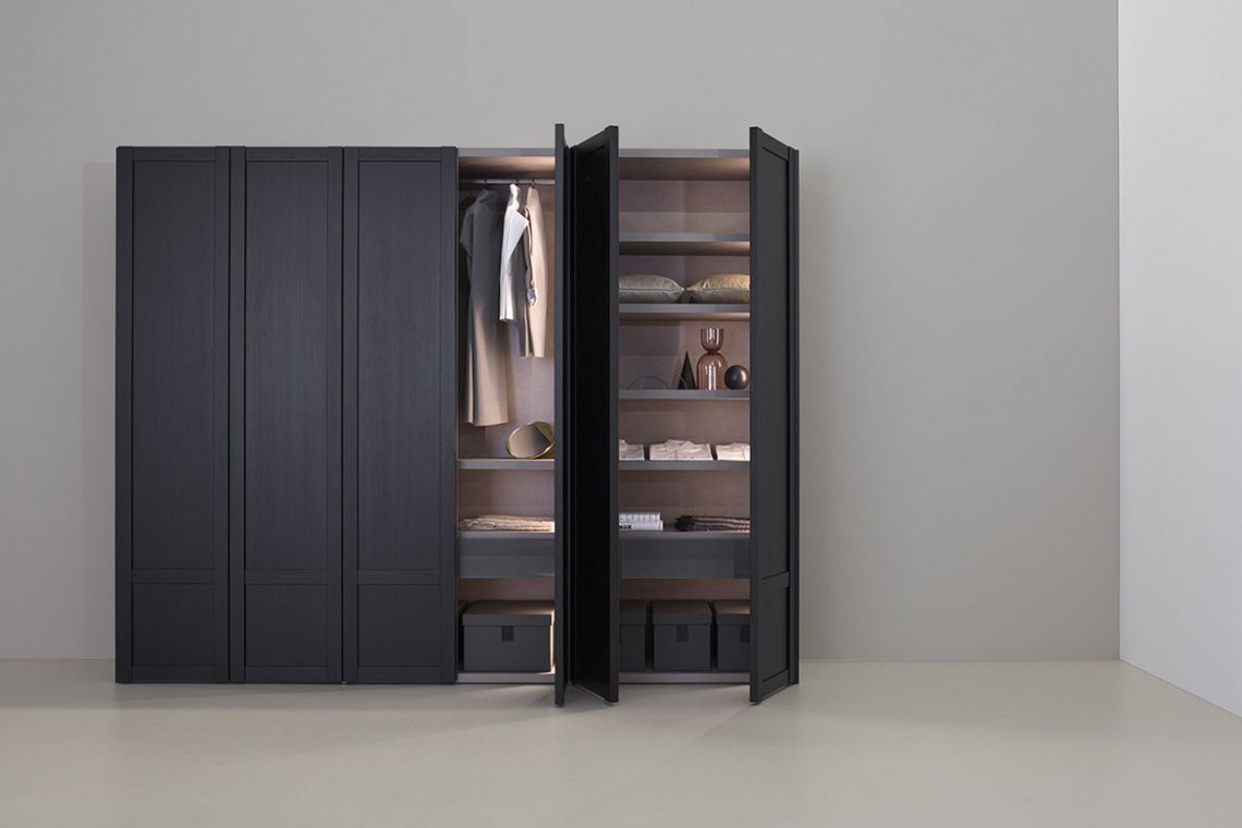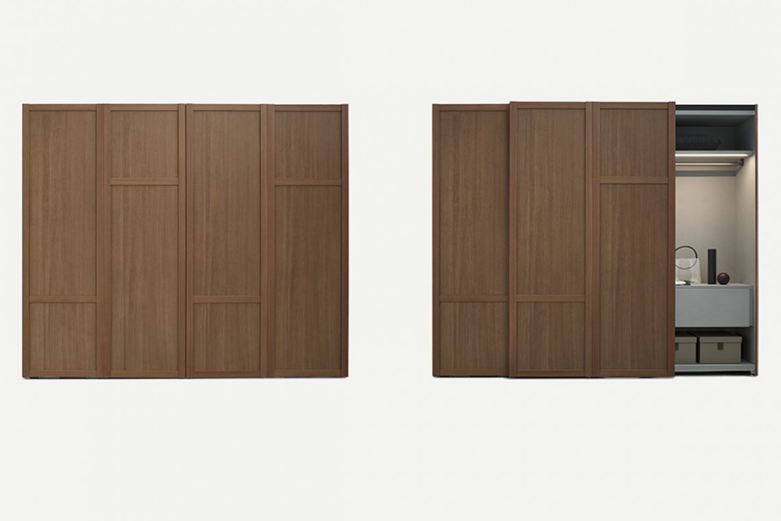 The features of the wardrobes of times past are dressed up with new style, thanks to a contemporary look that still evokes domestic memories. The Verona wardrobe, with the full charm of old-fashioned reminiscence, is a new take on the classic framed door fronts and plays with squared forms of different dimensions that create encounters of vertical and horizontal lines, and symmetrical and asymmetrical, linear and alternating compositions. A vertical groove in the wardrobe frame, worked into the rising strut, ensures discreet, elegant opening, with no visible handles. It is the sensation of discreet, measured elegance and gracefulness which reveals itself at the right time. The design highlights the quality of the craftsmanship, the character of the wood and the value of its solid construction.