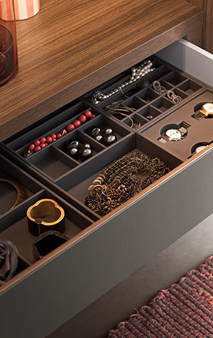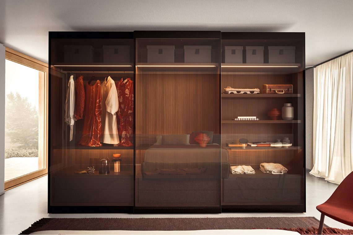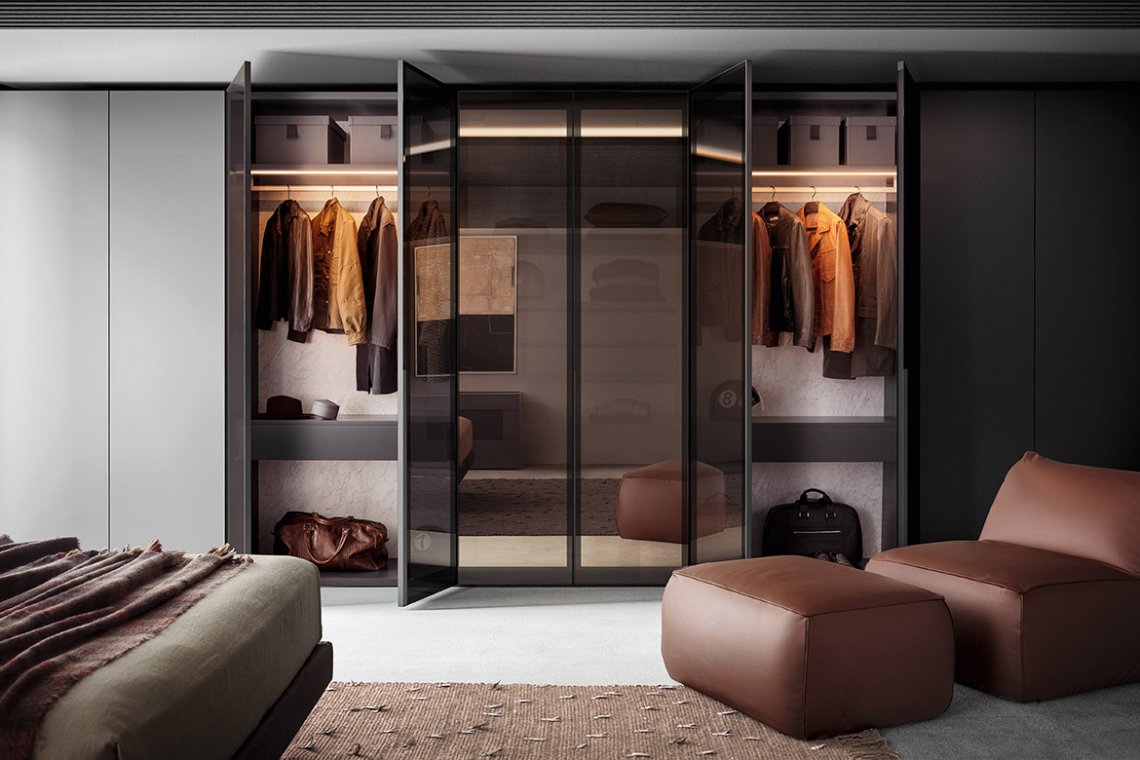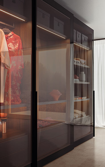 Glass reveals, reflects and mingles the inside with the outside in the most fascinating of ways. The mediator of this dialogue is the glass door panel, in Extraclear Transparent, Transparent or Satin Fumé and Stop Sol finishes and in the three colours available for Trama screen-printed glass: different aesthetic features for varying degrees of transparency. The door sports an intriguing, black, screen-printed frame. The long, slim, inclined handle is made from black anodised aluminium matching the frame and is discreet and handy on both hinged and sliding doors.