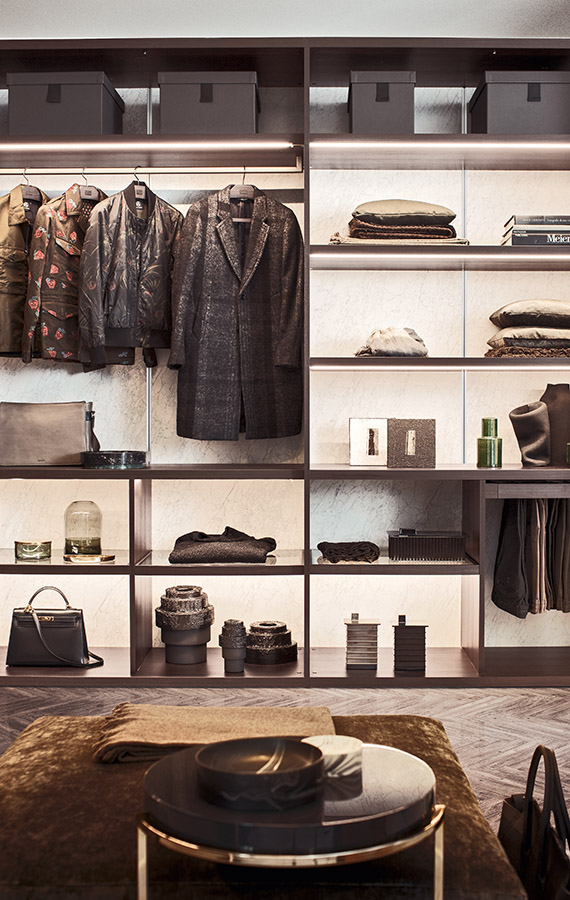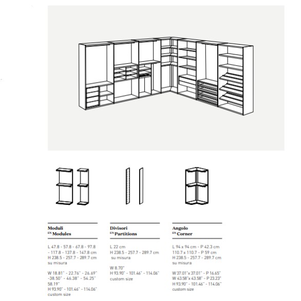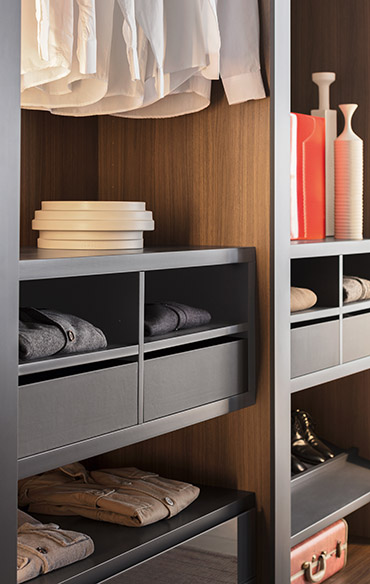 Curtains dissolve to reveal elegance, order and refinement on stage. Sipario is made up of wardrobe modules without doors that can be unrestrictedly put together to suit individual practical requirements and aesthetic preferences. In the framed version, the vast array of finishes is enhanced by a wide frame that gives the arrangement an even warmer and more sophisticated appeal. To satisfy any requirement, our range of interior accessories is the same available for our wardrobes.