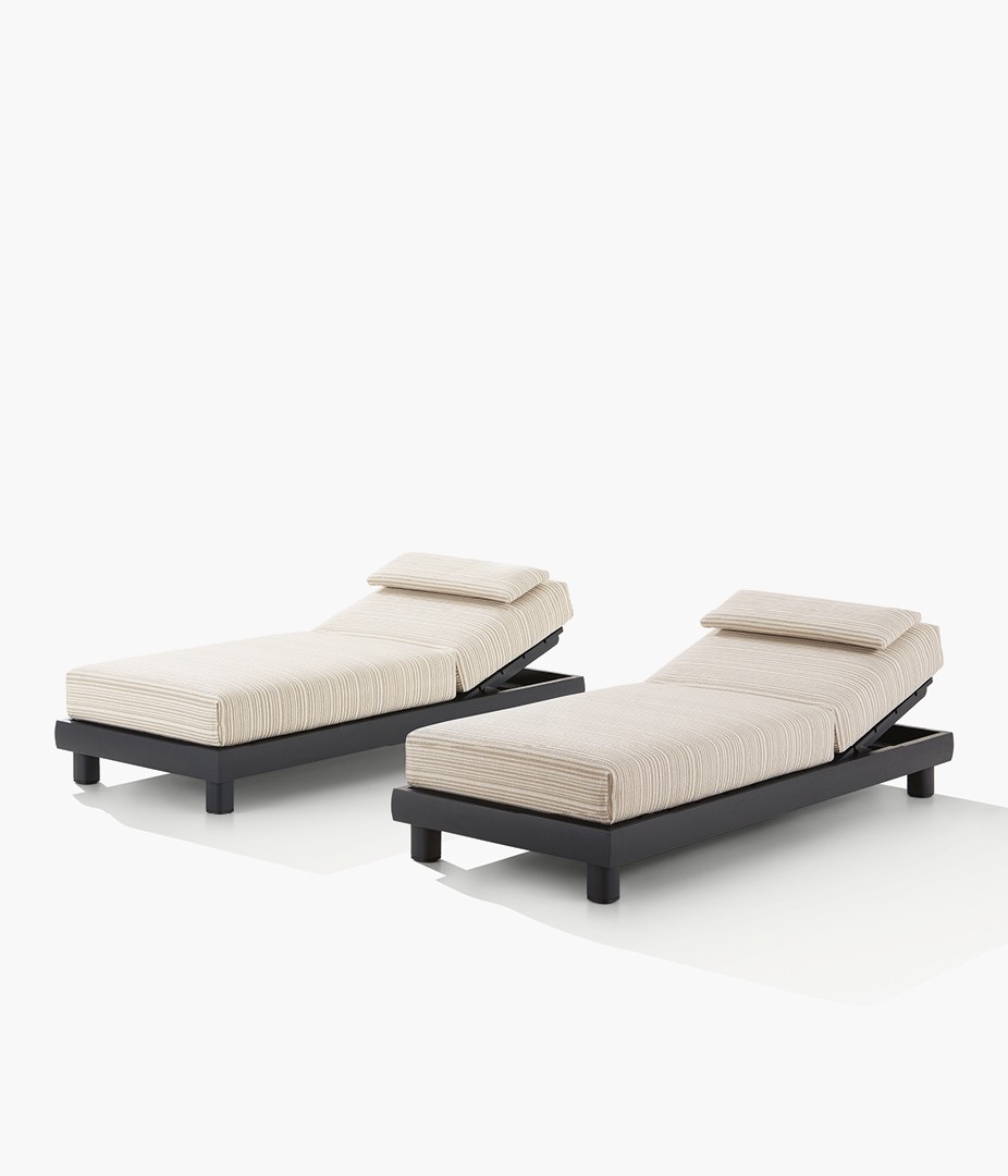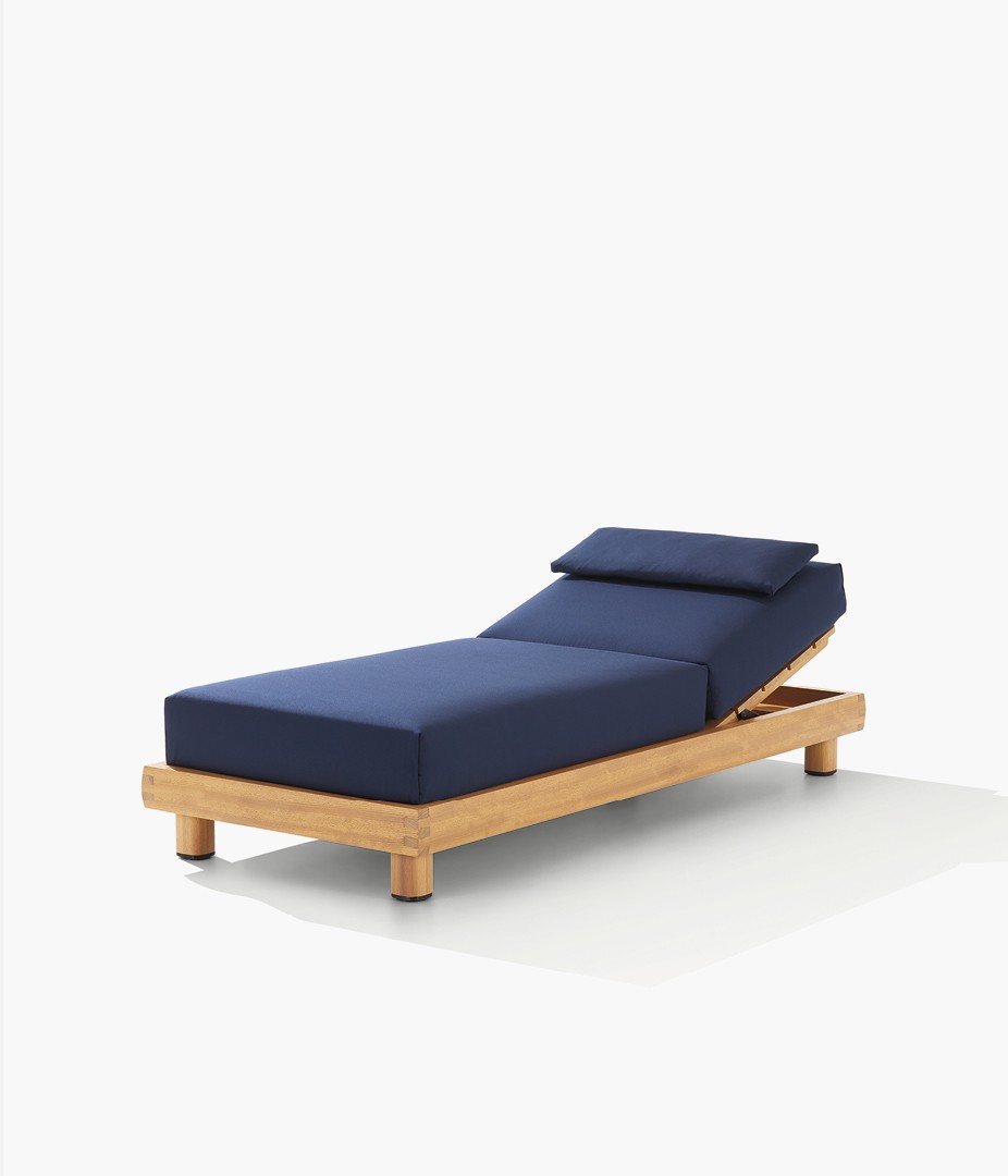 Jean-Marie Massaud設計的Ketch系列從航海世界中汲取靈感,新增了戶外日光浴床以豐富該系列產品。與沙發和扶手椅一樣,日光浴床也采用了堅固而簡潔的大綠柄桑木材制結構,支撐著柔軟的座墊。可調節的靠背配有頭枕,使其更加舒適,此外還有一個隱藏式實用隔層,可用于存放布料用品和配飾。