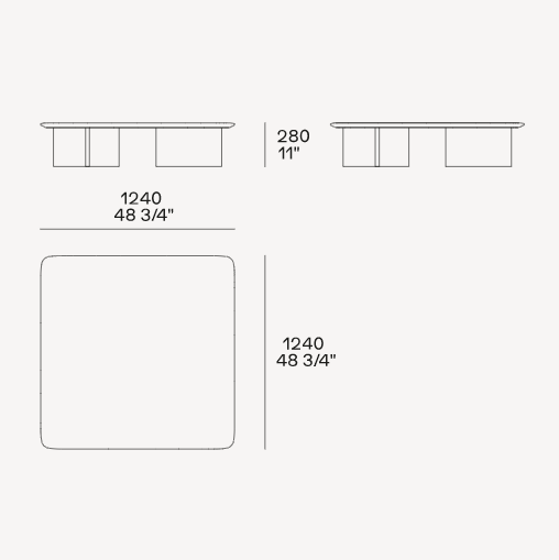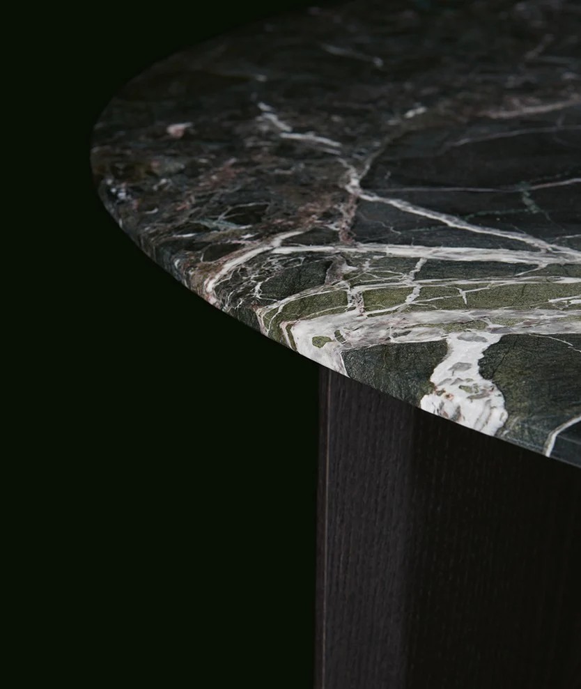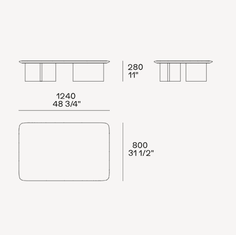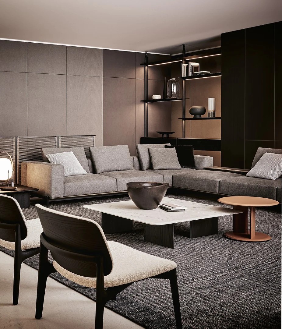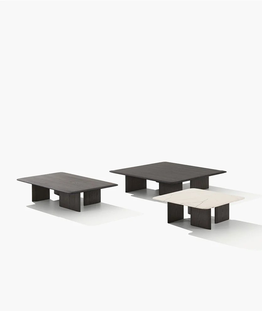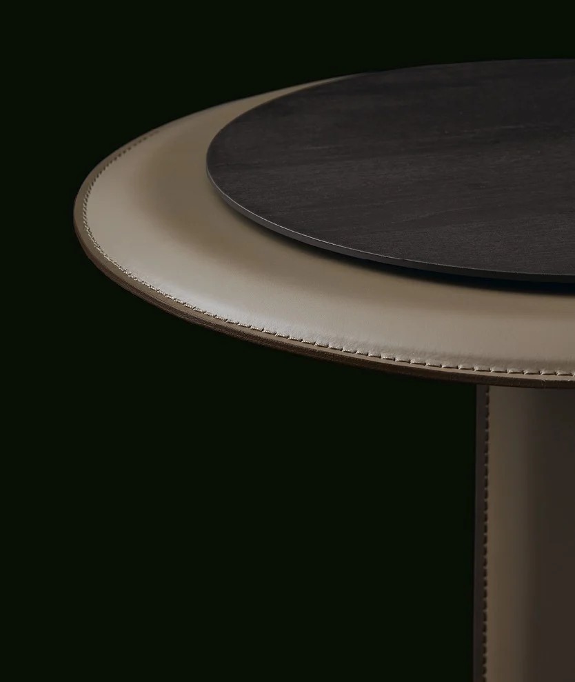With a choice of a square or rectangular top with rounded corners or a round top, it comes in different heights and sizes. In the olmo nero version, the thickness of the tabletop is the result of hand crafting. The round and tall version of the coffee table, which is ideal for placing next to the Brera sofa, is also available completely covered in leather.