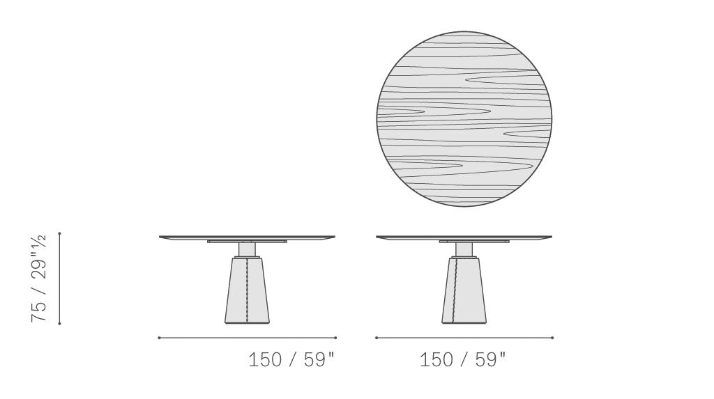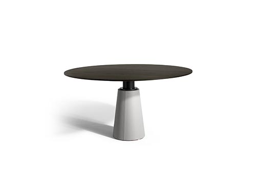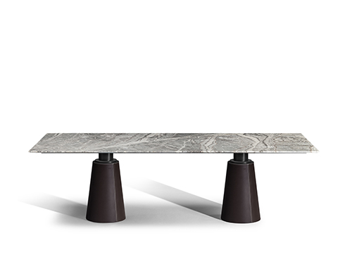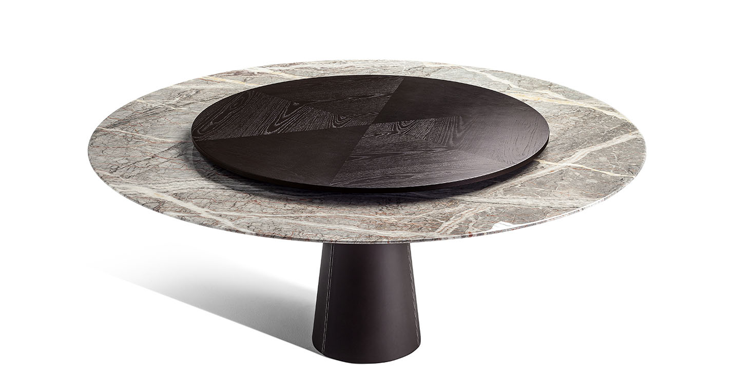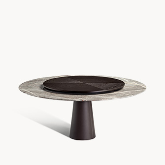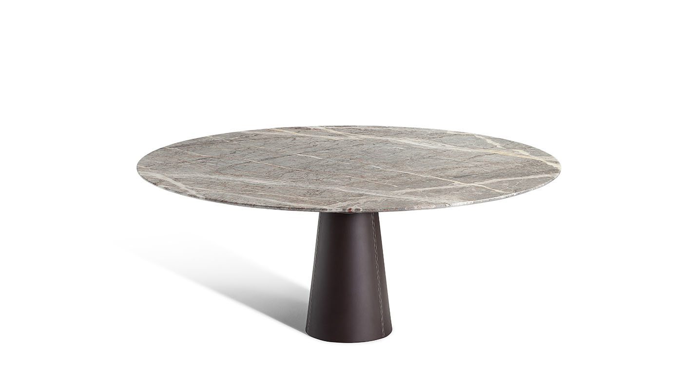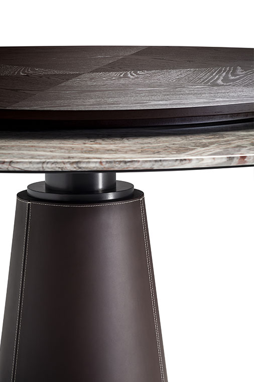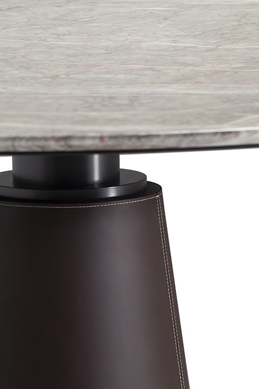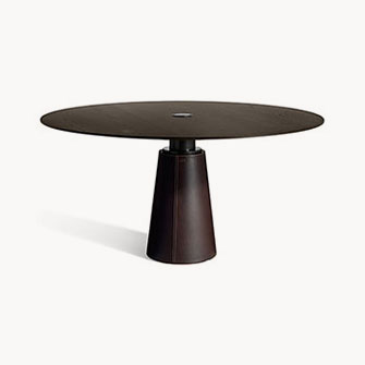 直徑135厘米的Mesa款式使用板巖桌面和塞茵那石支柱,此外還有其它尺寸,擴展用途,并發展為Mesa Due款式:直徑150厘米的午餐桌、直徑120厘米的便餐桌。桌面使用中密度木質纖維,鑲貼雞翅木色或摩卡色梣木片,或覆蓋Pelle Frau?軟皮。Mesa Due基座可以為灰色塞茵那石或鋼材,后者覆蓋Cuoio Saddle Extra皮革并使用對比色縫線,或Pelle Frau? Color System軟皮并使用同色深淺縫線。鋼制底座通過特殊的內部配重系統保持穩定性,端部具有塑料塑形包頭,用于保護地板。桌面和支柱之間的連接為棕黑漆鋼管,支撐一個三臂交叉支桿,配有調節支架用于桌面調平。