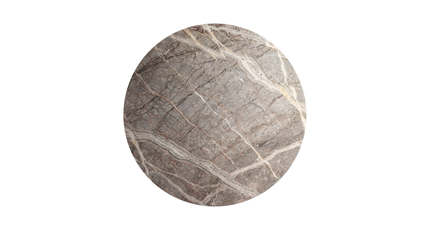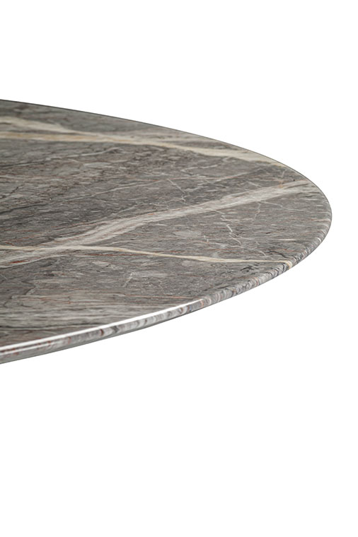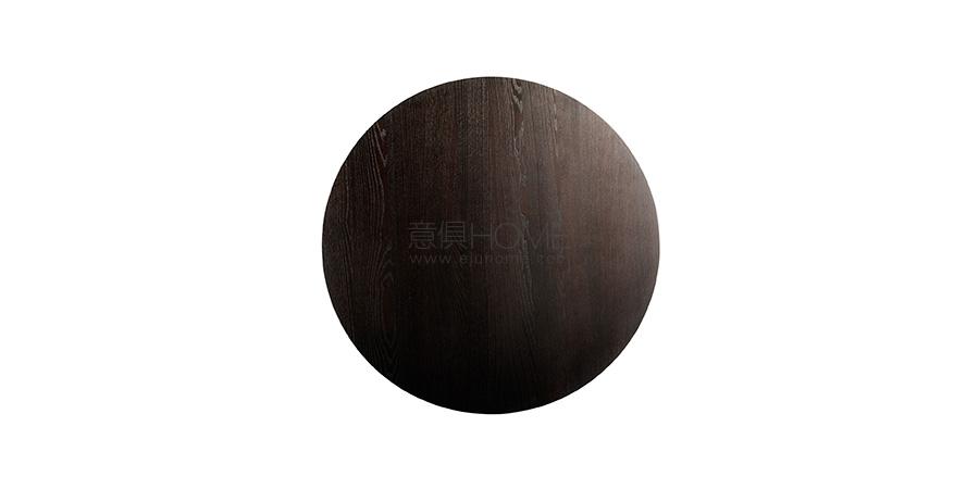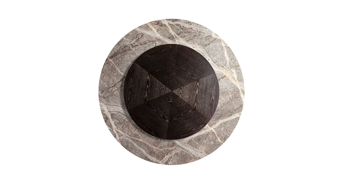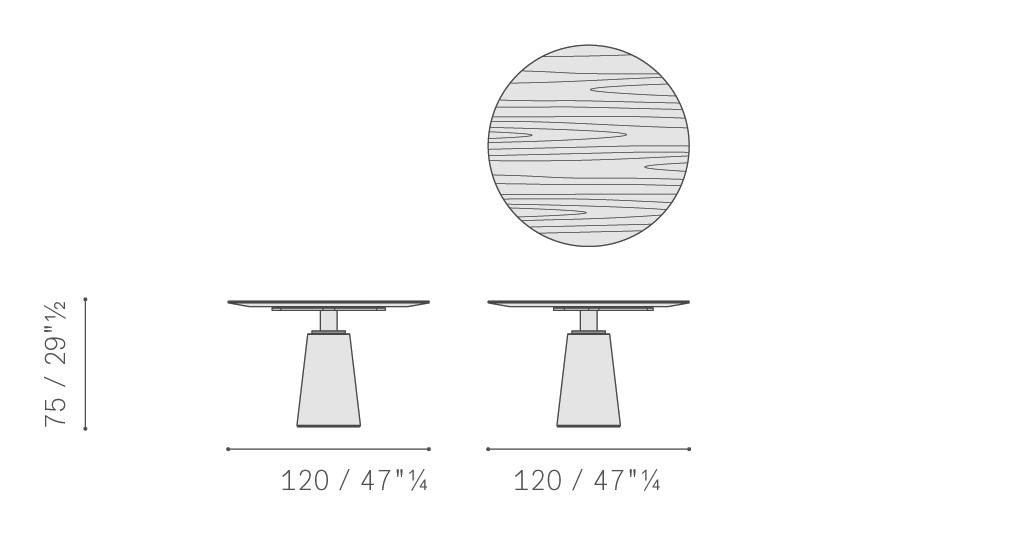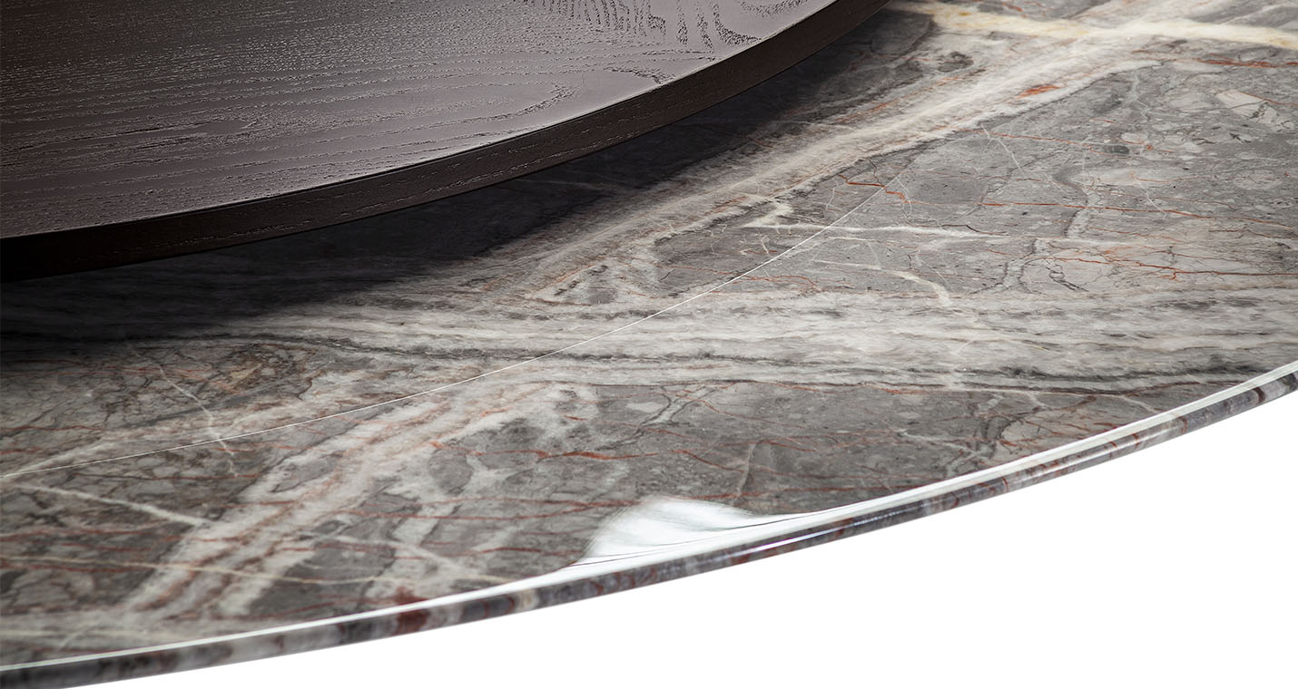 直徑135厘米的Mesa款式使用板巖桌面和塞茵那石支柱,此外還有其它尺寸,擴展用途,并發展為Mesa Due款式:直徑150厘米的午餐桌、直徑120厘米的便餐桌。桌面使用中密度木質纖維,鑲貼雞翅木色或摩卡色梣木片,或覆蓋Pelle Frau?軟皮。Mesa Due基座可以為灰色塞茵那石或鋼材,后者覆蓋Cuoio Saddle Extra皮革并使用對比色縫線,或Pelle Frau? Color System軟皮并使用同色深淺縫線。鋼制底座通過特殊的內部配重系統保持穩定性,端部具有塑料塑形包頭,用于保護地板。桌面和支柱之間的連接為棕黑漆鋼管,支撐一個三臂交叉支桿,配有調節支架用于桌面調平。