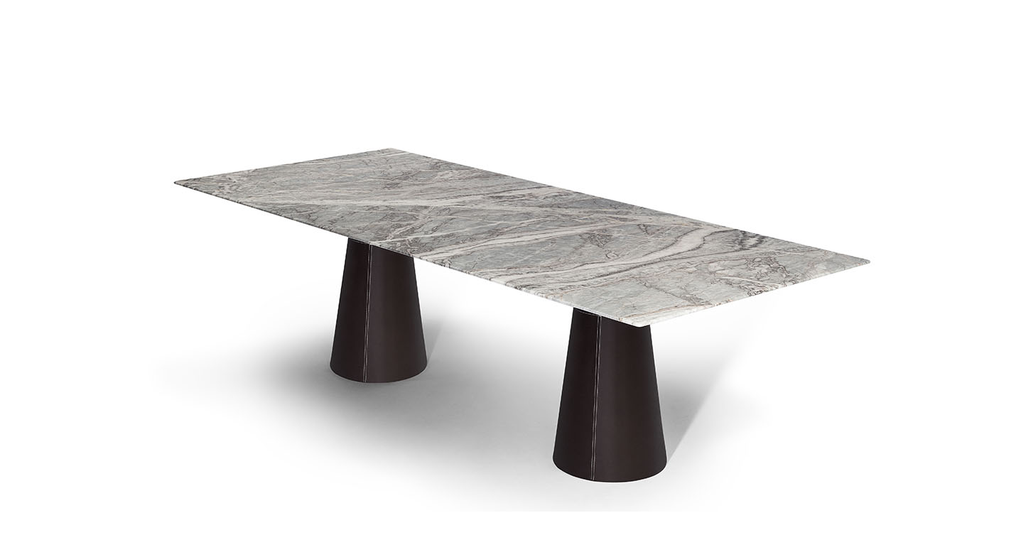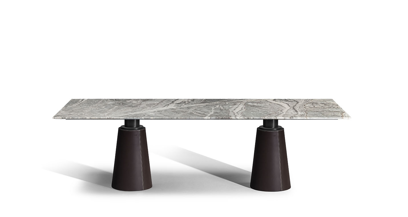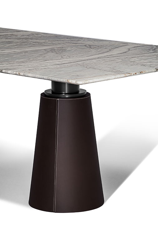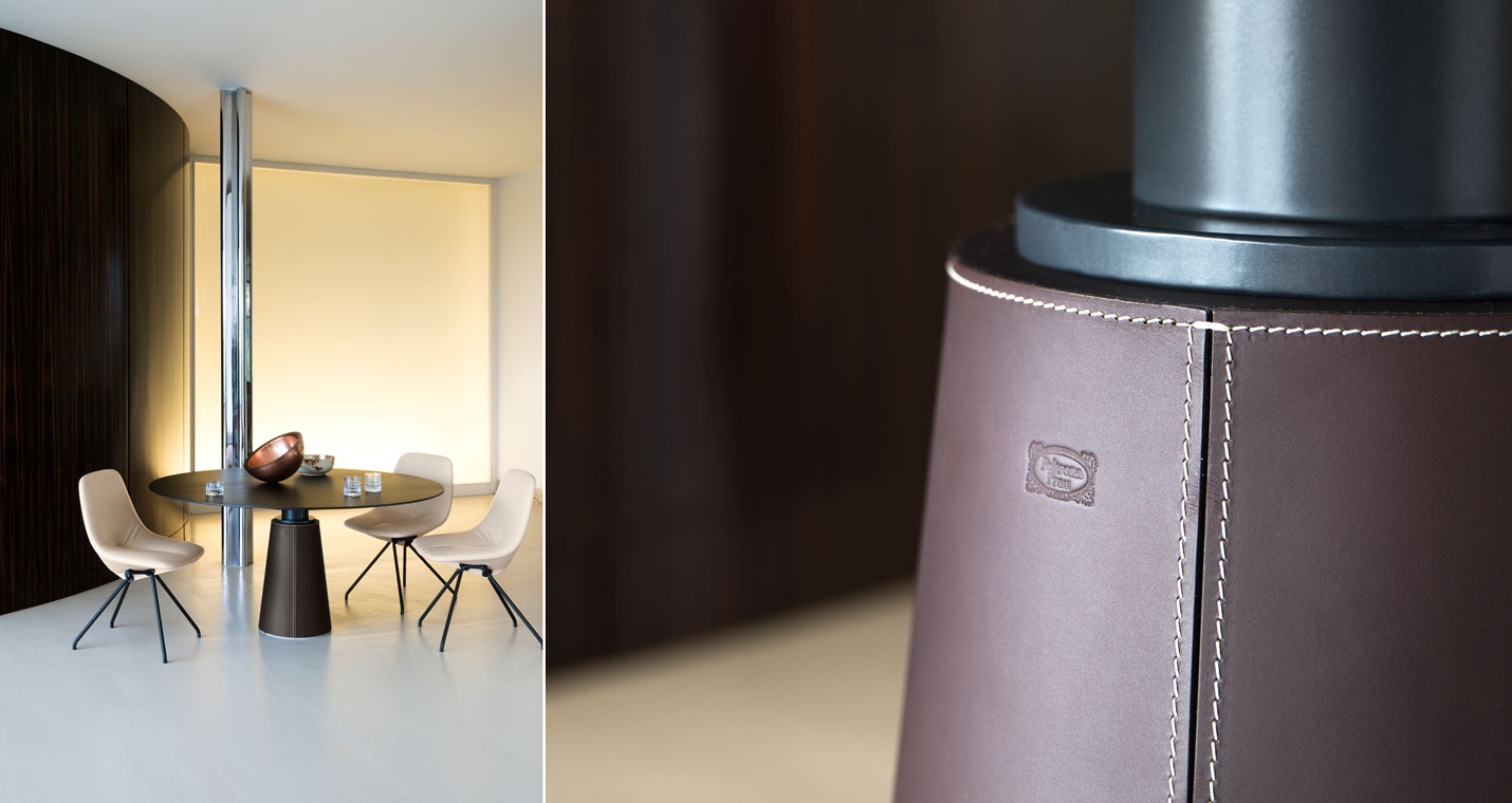 Mesa Due餐桌采用軟皮和皮革支桿,可以安裝電動伸縮塔柱,由客戶在購買時選擇和指定。