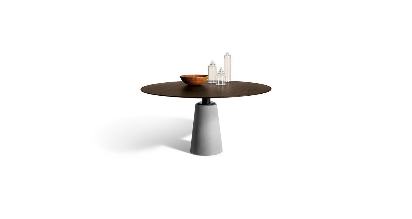 Poltrona Frau圍繞Mesa計劃展開了一項有意思的語義學工作:在Lella和Massimo Vignelli簽名的原始圖紙基礎上,制作出兩款前所未有的原創餐桌,恰好命名為Mesa和Mesa Due。兩個簡單的幾何形狀,一個圓形,一個錐形,互相結合,構成極具個性、具有強烈圖形標記的餐桌。