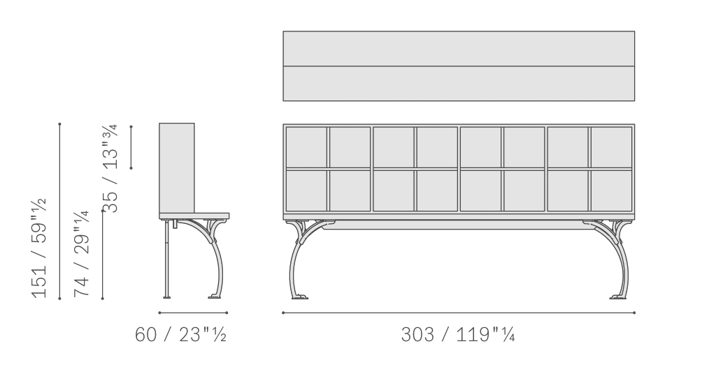 Sangirolamo書柜具有條板式結構,采用杉木實木木芯,每側覆蓋兩層楊木片和中密度纖維板片。桌面使用多種條板組合,采用杉木實木木芯,每側覆蓋兩層楊木片和中密度纖維板片。表面處理使用黑核桃木貼片。桌面以外側金屬橫撐加固。底部表面處理使用黑核桃木或啞光黑色漆繪木材。支柱使用粉末噴漆鑄鐵熔鑄而成。