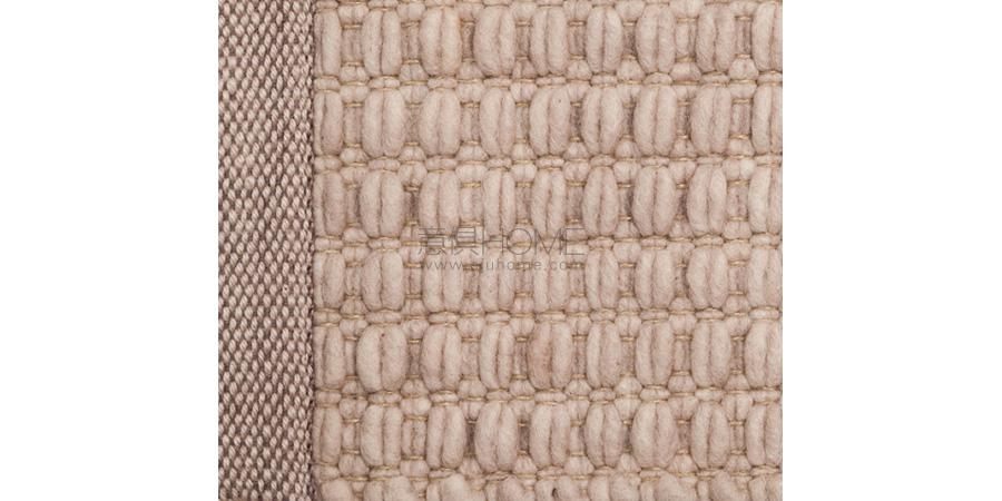 Pecan地毯表面經過精心處理,兩個短邊采用40毫米的包邊,使用巴拿馬結構面料,與地毯本身色調相同和構成對比的線材交替使用。使用表面成分為100%羊毛,結構+使用表面成分為40%黃麻和60%羊毛。總體厚度為12毫米,重量為2.