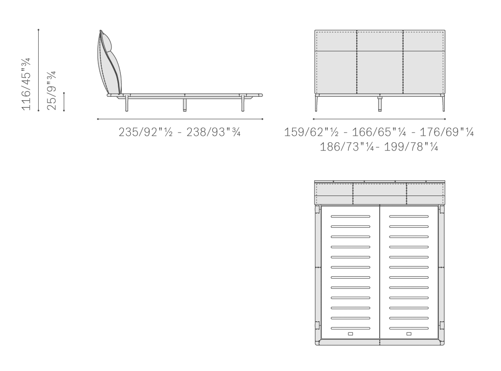 Mr Moonlight床的床頭結構采用楊木實木和樺木膠合板結構,填以聚氨酯泡沫,配有鵝絨靠墊。基座為櫸木膠合板。床欄使用軋制鋁,邊角使用印壓鋁,床腳板和支腳使用鍍釕表面處理。床面使用樺木膠合板。基座和床頭表面覆蓋Pelle Frau?軟皮,同時搭配布藝,或覆蓋Cuoio Saddle皮革并搭配Pelle Frau?軟皮或布藝。