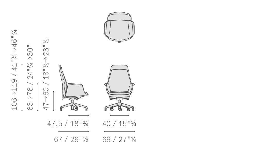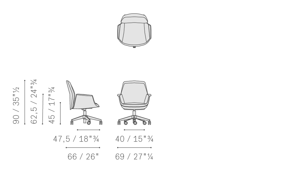 DownTown扶手椅分為5種款式:President、Executive、Managerial、Meeting和Visitor。表面覆蓋Pelle Frau?軟皮,裝飾同色深淺縫線或?qū)Ρ壬p線,同時(shí)也有在靠背墊、扶手和靠墊內(nèi)表面采用微孔工藝的版本。支承底座使用拋光或黑色噴漆,在President、Executive、Managerial和Meeting版本中由5個(gè)支腳座城,配有“W”型軟質(zhì)自轉(zhuǎn)自鎖輪,適合各種類型的地面。Visitor版本則使用四支腳底座,配有塑料旋轉(zhuǎn)滑槽,如有需要也可為其它版本配置。DownTown扶手椅可以調(diào)整高度,也可以圍繞自身旋轉(zhuǎn),此時(shí)需要向上提拉位于座椅右側(cè)下方的手柄。President、Executive和Managerial版本在靠背和座椅上配有“Syncron”振蕩機(jī)械系統(tǒng),使得扶手椅能夠極為輕松的跟隨身體動(dòng)作,適應(yīng)身體移動(dòng),保證超高的舒適性。扶手椅機(jī)械裝置可以鎖定在4個(gè)位置上。DownTown Meeting可以憑借推力滾珠軸承圍繞自身旋轉(zhuǎn)。DownTown Visitor配有自歸位旋轉(zhuǎn)機(jī)械系統(tǒng),可以憑借推力滾珠軸承使得扶手椅圍繞自身旋轉(zhuǎn)并回到初始位置。