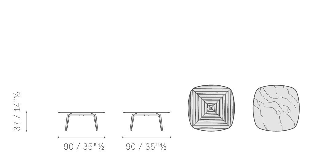 基座為摩卡色或雞翅木色梣木實木,具有特色三角形截面。Fiorile咖啡桌桌面可以使用Pelle Frau?軟皮、帶摩卡色或雞翅木細木鑲嵌工藝梣木貼面的樺木膠合板、拋光Emperador(金峰)大理石、或拋光和半拋光Calacatta Oro(卡拉卡塔金)大理石。