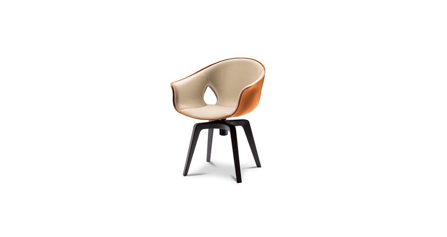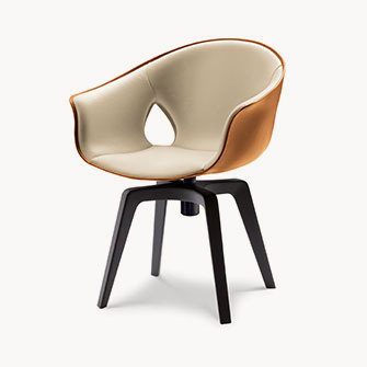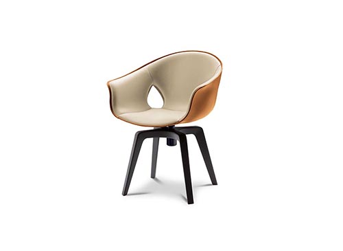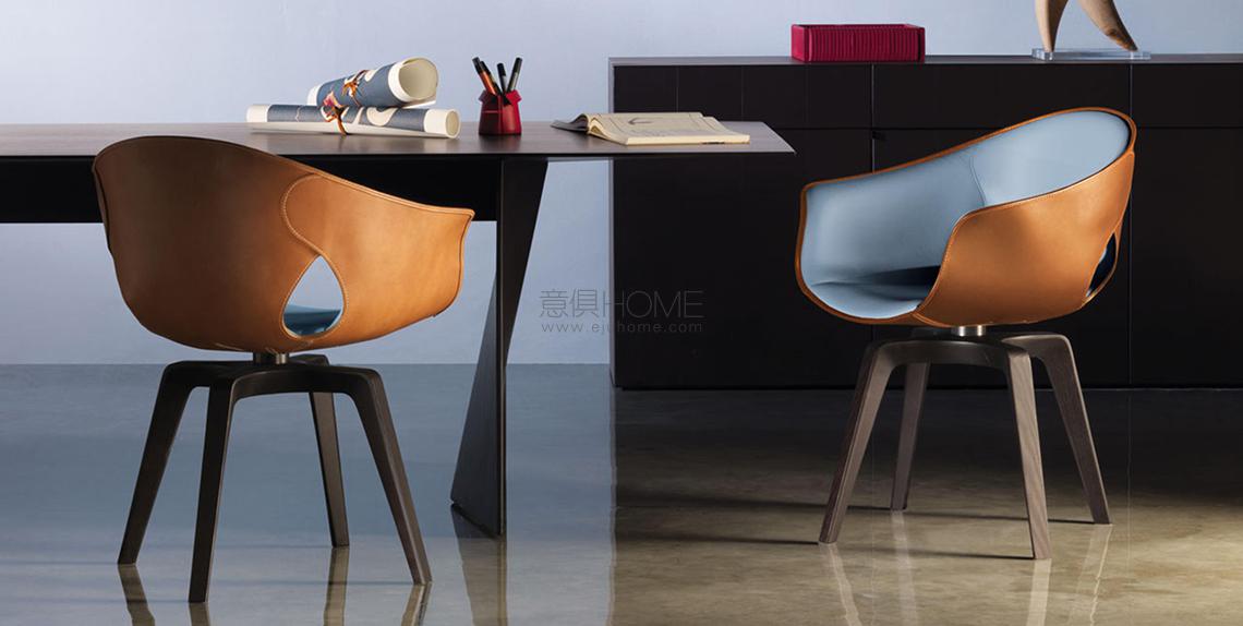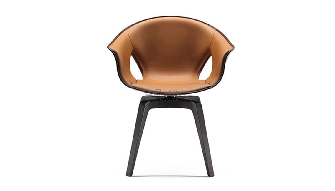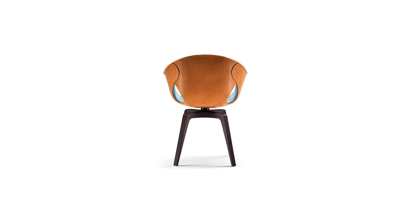 Ginger小扶手椅主體采用印壓成型合成熱塑聚酯。主體與基座之間的固定通過黑漆鋼支架實現(xiàn)。旋轉(zhuǎn)版本中,可以旋轉(zhuǎn)360°并回到初始位置。包墊采用聚氨酯泡沫。Ginger外部覆蓋厚度4毫米的無接縫Cuoio Saddle皮革或Saddle Extra皮革。內(nèi)部覆蓋Pelle Frau?軟皮,具有令人喜愛的材質(zhì)對比。四支腿底座使用雞翅木色或摩卡色梣木實木,具有三角形截面。