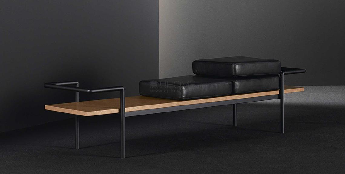 T904長凳結構由黑漆鋼管精準描繪。坐墊極為簡單,桌板采用楊木膠合板,貼面為柚木色梣木,能夠與三個靠墊隨意搭配,簡單地放在木制平面上。靠墊包墊采用聚氨酯泡沫和滌綸填充。表面覆蓋Pelle Frau?軟皮或可拆洗布藝。