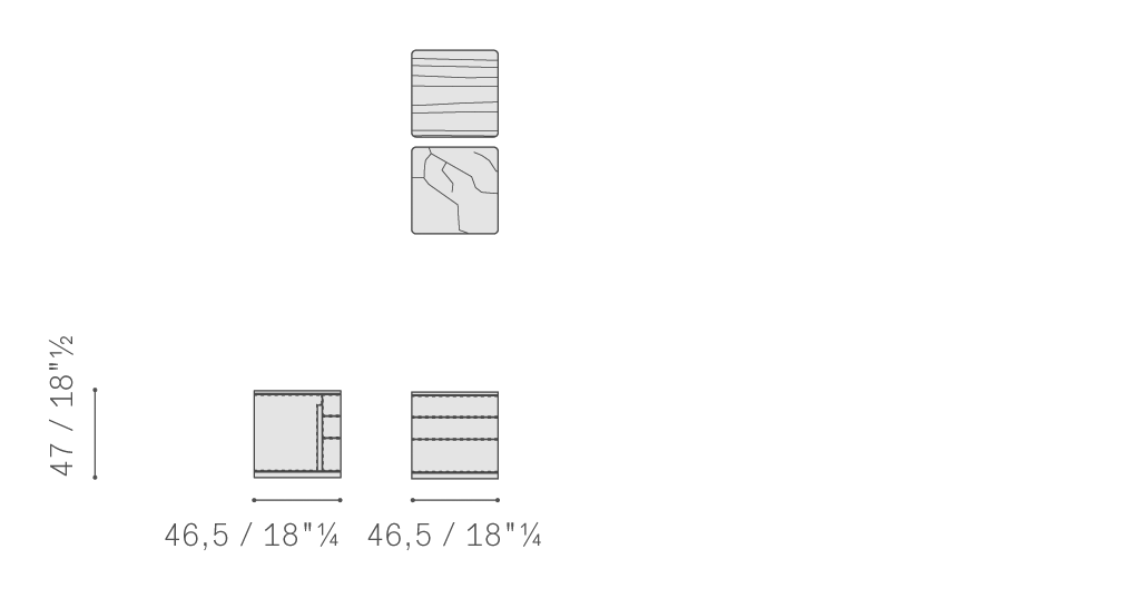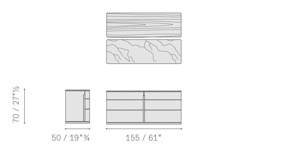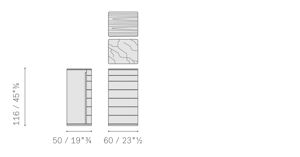 Fidelio Notte抽屜柜、七斗小柜和床頭柜的支撐結構使用黑核桃木實木和樺木膠合板,并配有黑胡桃木貼面。抽屜外側和兩側覆蓋Cuoio Saddle或Saddle extra皮革,使用同色深淺或對比色縫線。如有需要,后側也可使用皮革覆面,否則使用黑胡桃木。在黑胡桃木臺面版本之外,使用半拋光表面處理Calacatta Oro(卡拉卡塔金)大理石臺面的Fidelio Notte版本更具材質美感。鋼制支腳可調。