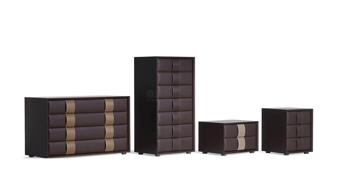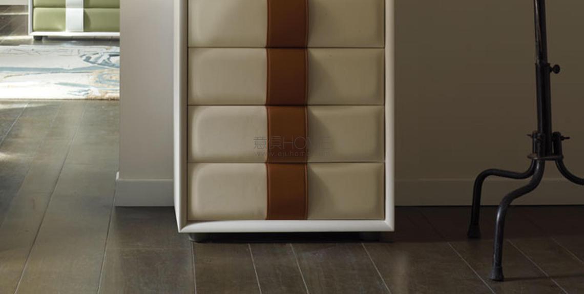 Obi收納柜系統可選奶白色防劃漆料漆繪,或使用木材,搭配棕胡桃木片貼面。Obi抽屜柜、床頭柜和七斗小柜的抽屜安裝在金屬導軌上,帶有緩沖閉合。抽屜面板和把手完全覆蓋Pelle Frau?軟皮,顏色相同或相異,使用同色深淺或對比色垂向縫線,具有細膩的裝飾效果。每個Obi收納柜的臺面均可根據需要配備典雅的Pelle Frau?軟皮墊。