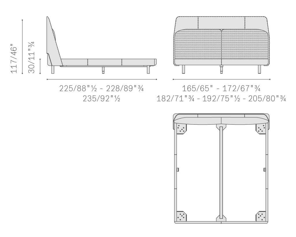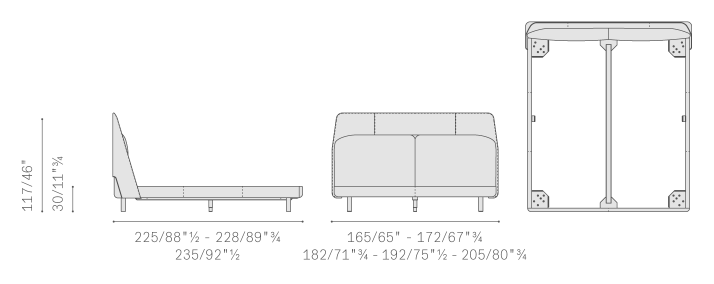 Coupé的床框,整個表面均由珍貴的Pelle Frau?皮革包覆,令嚴謹且簡潔的外觀呈現柔軟感覺。精美的縫線針腳朝皮革床頭板匯聚,床頭板由山毛櫸實木和樺木膠合板制成,襯以硬質纖維板,并略微填充聚氨酯泡沫。側面的兩個成型部分,采用聚氨酯泡沫模壓制成。床頭設計包容且溫馨,擁抱著床身,卻不會喧賓奪主。柔軟的橫向靠墊采用可拆卸織物或軟皮外套,在De Luxe 版本上還帶有刺繡,靠墊成為了床頭的一部分,彰顯其原創性。包覆材料的觸感和材質差異突出了設計的純粹感和比例的平衡。纖細的金屬床腳采用槍管色表面處理,為整個結構增添了挺拔和輕盈感,床的結構使用杉木條和楊木膠合板制成,并利用黑漆鋼板結構元素進行加固。Coupé 床, "Queen-size"和"King-size"兩個版本除外,均可搭配長度為200 cm 或 210 cm的床架和床墊 。