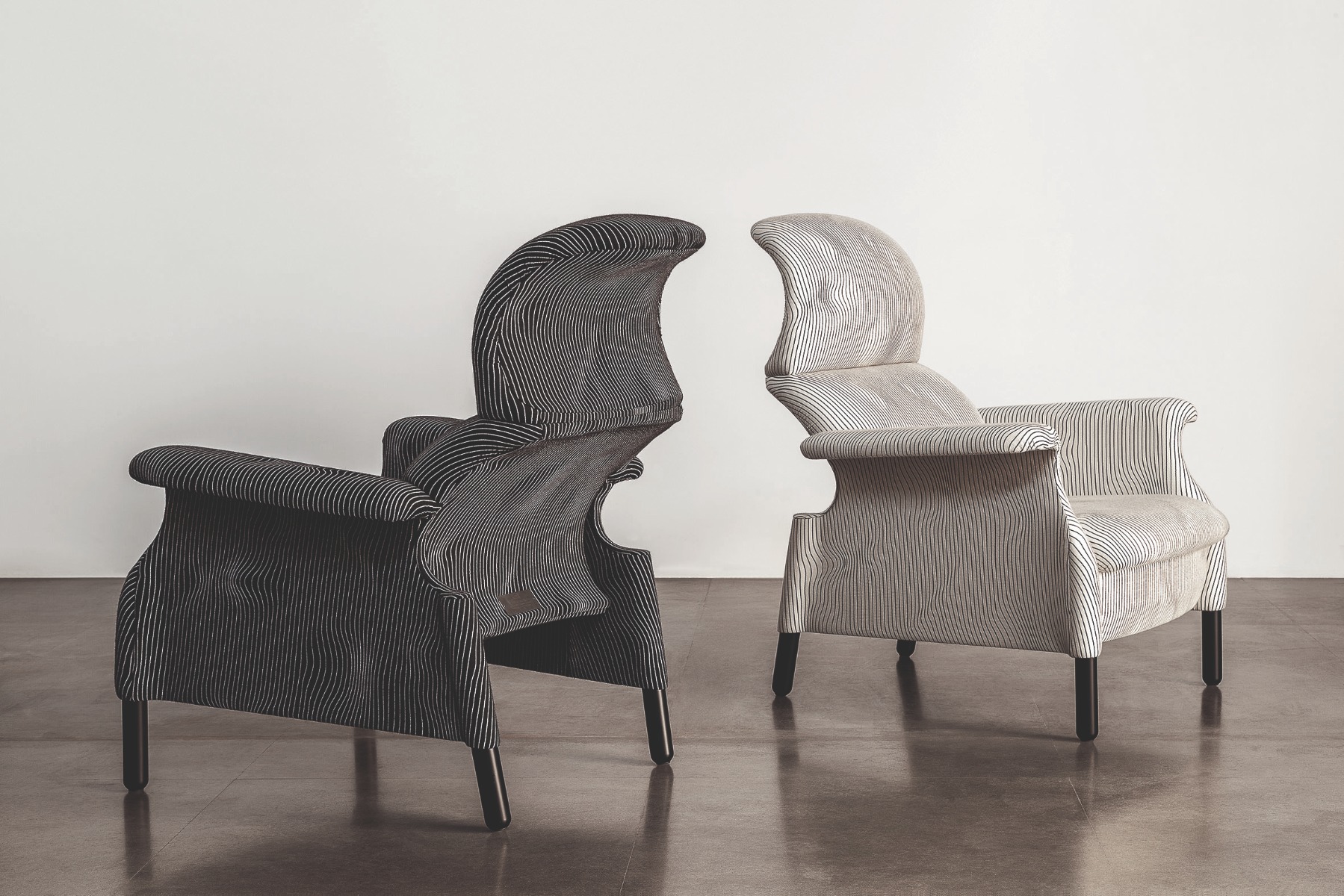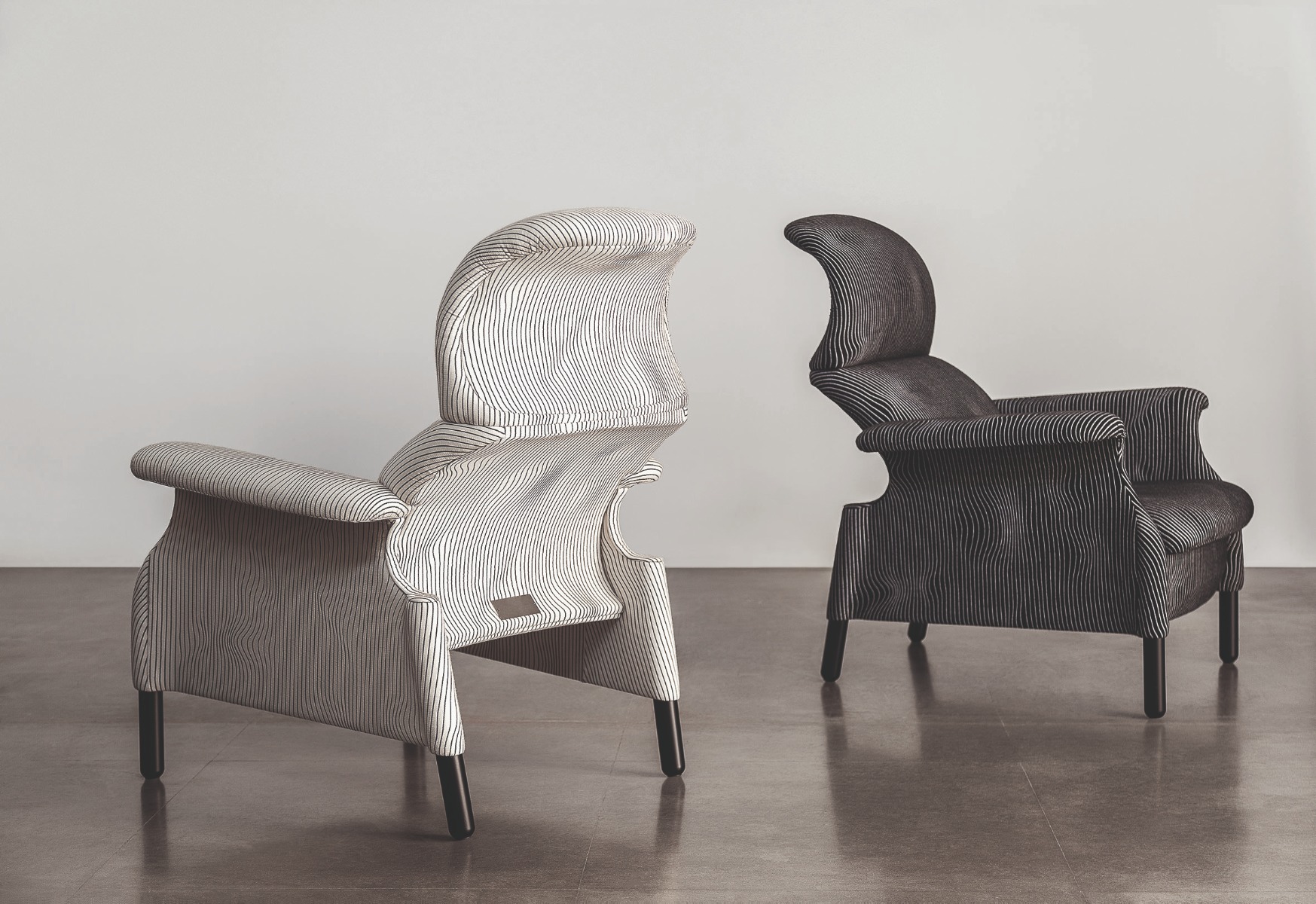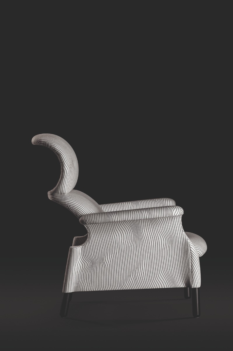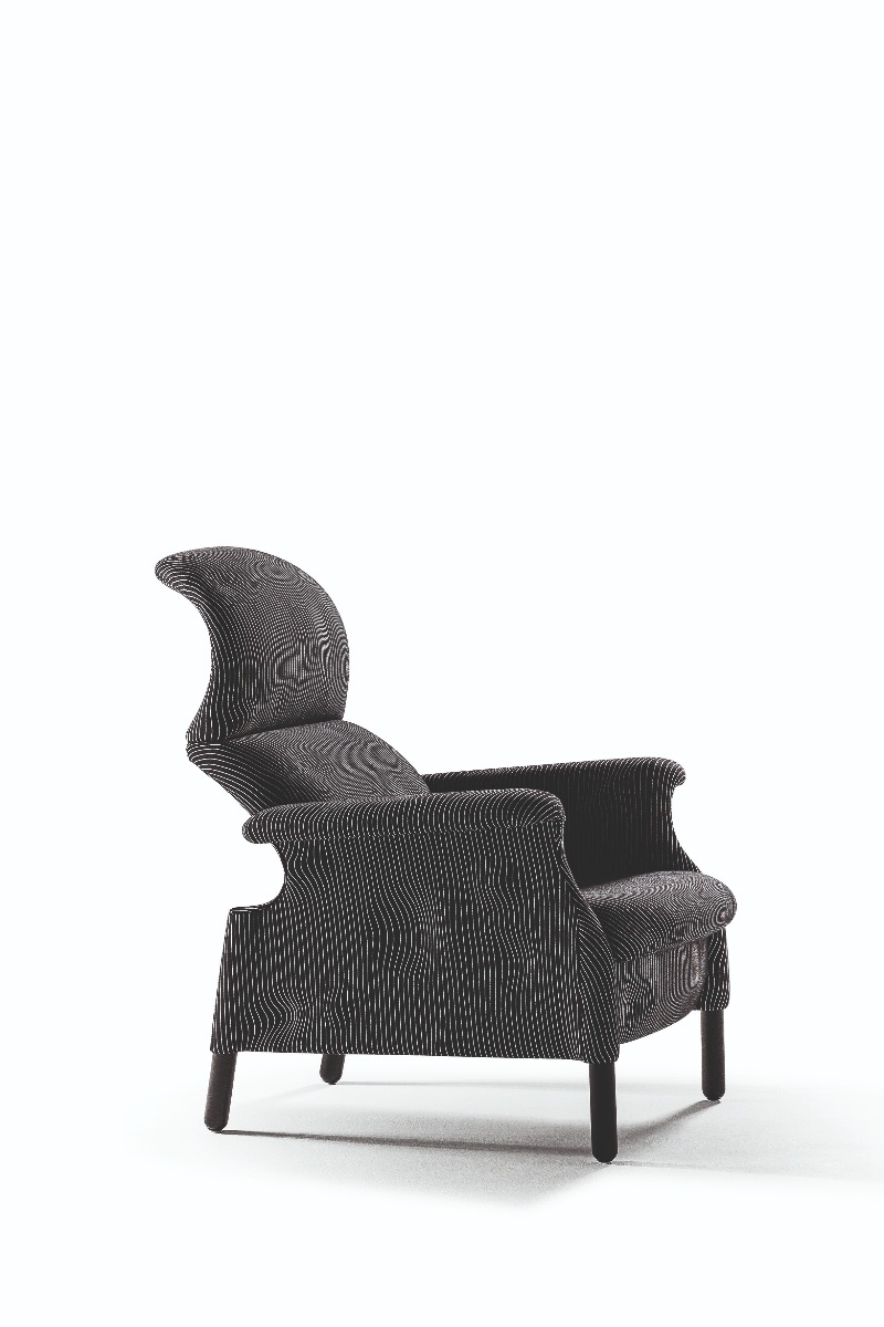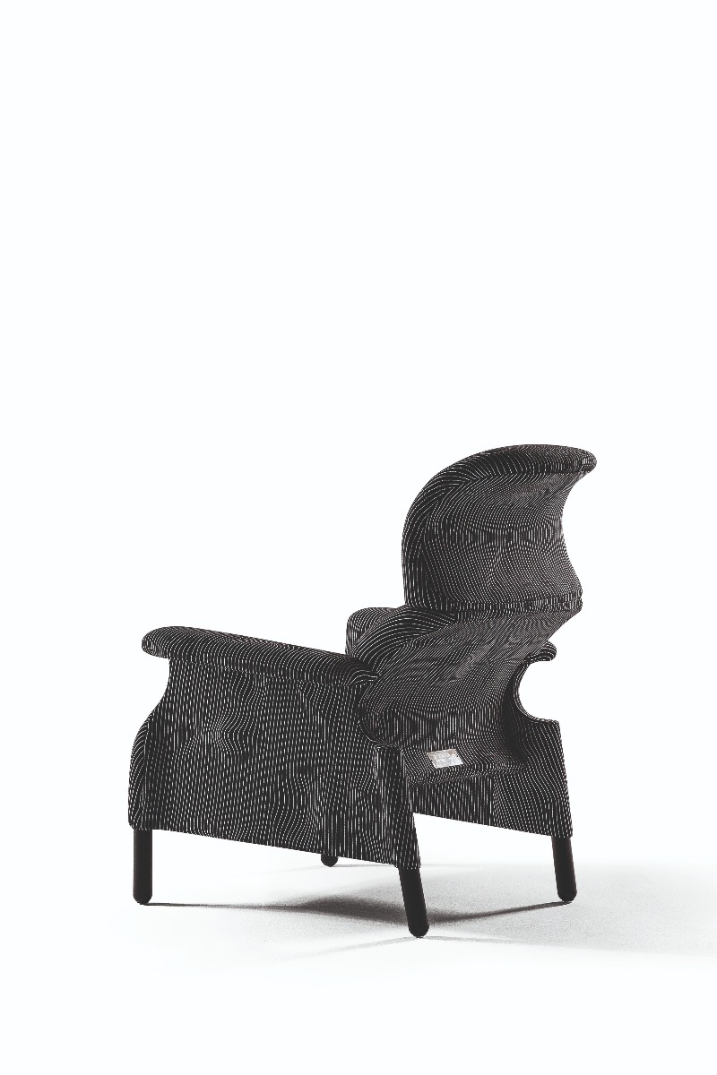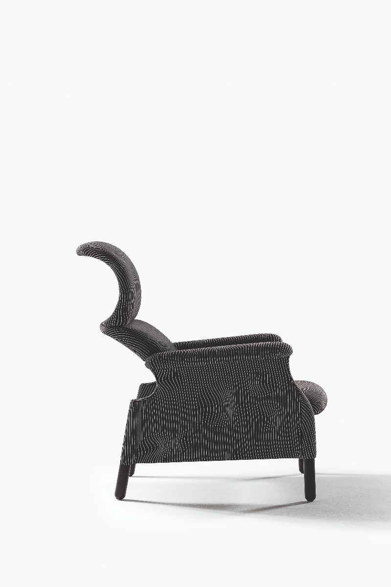 Sanluca沙發(fā)椅的理念在于清空傳統(tǒng)包墊,獲得“絕對(duì)必要”的曲線,以提供最佳支撐,其外形似乎能夠完美包裹身體。硬質(zhì)結(jié)構(gòu)采用木材,通過組裝單獨(dú)元件而構(gòu)成。表面覆蓋提花織造特制布藝,首次采用Max Huber于1968年設(shè)計(jì)的名為《Onde Geofisiche》(地質(zhì)波)的圖案。提供兩種顏色:白色底色搭配黑色條紋,黑色底色搭配白色條紋。支腳使用雞翅木色白蠟?zāi)緦?shí)木。